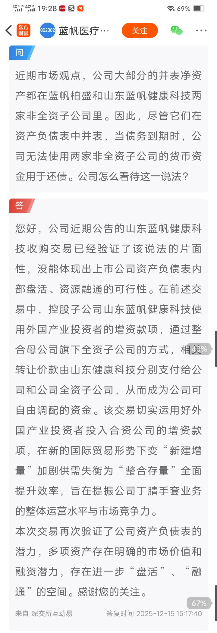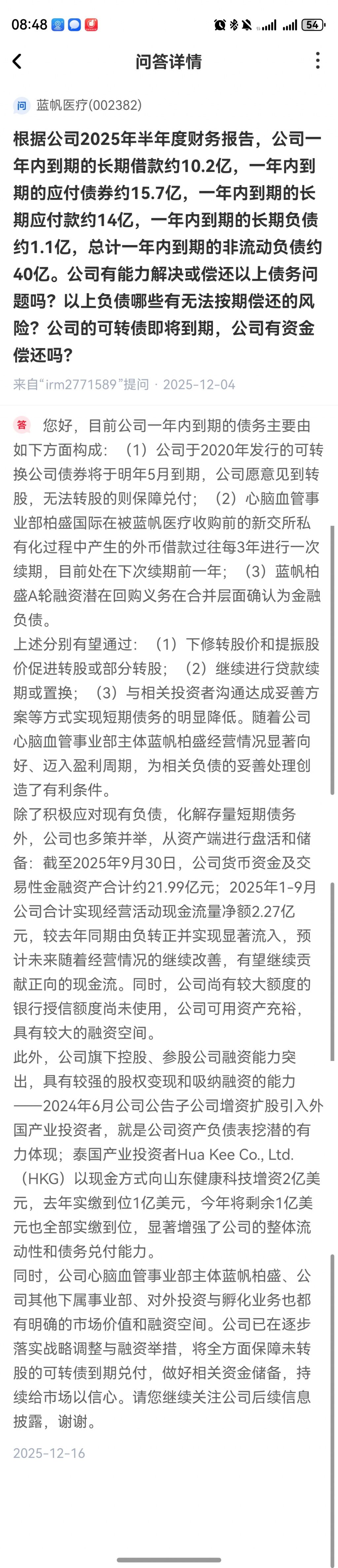 对蓝帆,公司最近的公告银行还在正常授信贷款。 心脑血管分部的业务发展也很不错,很难相信公司最后会违约。