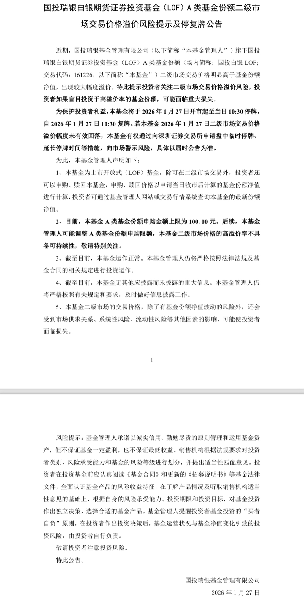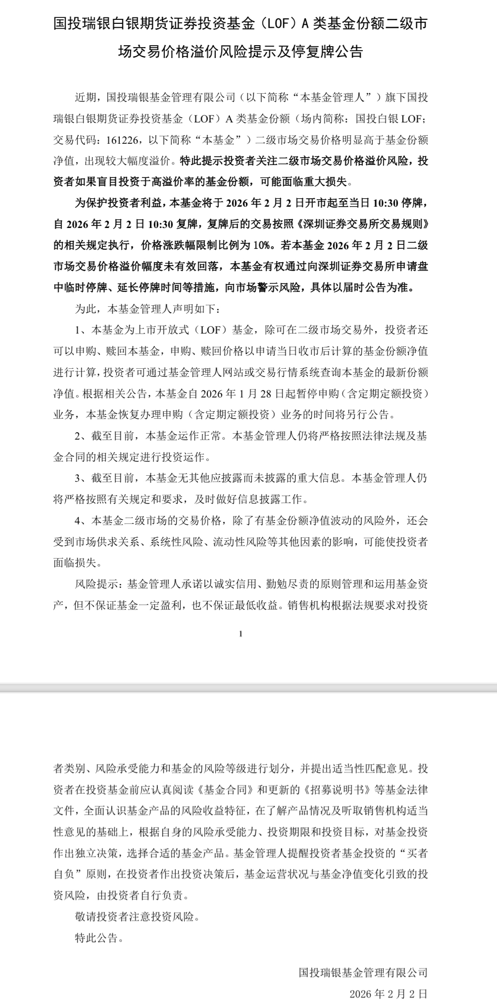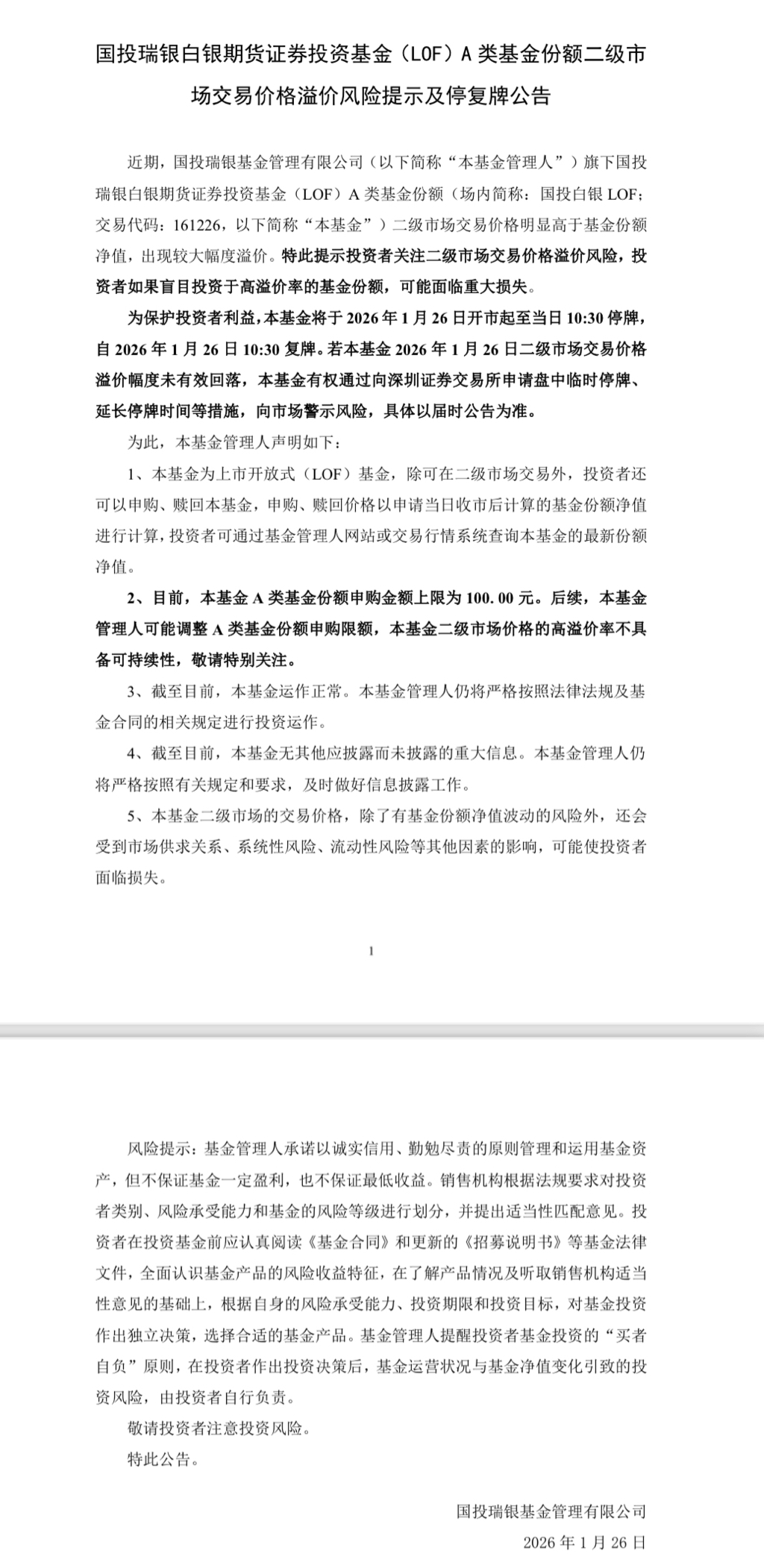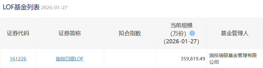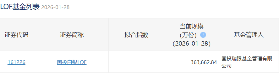 转:根据上海期货交易所1月21日收盘数据,白银主力合约(AG2604)单边总持仓量为30.22万手,国投瑞银一家持仓占比约9.93%,已经接近监管层的红线——单一公募基金持仓占比不能持续超过10%,否则将涉嫌操纵市场。这也意味着在目前情况下,该基金的规模扩张已无空间。