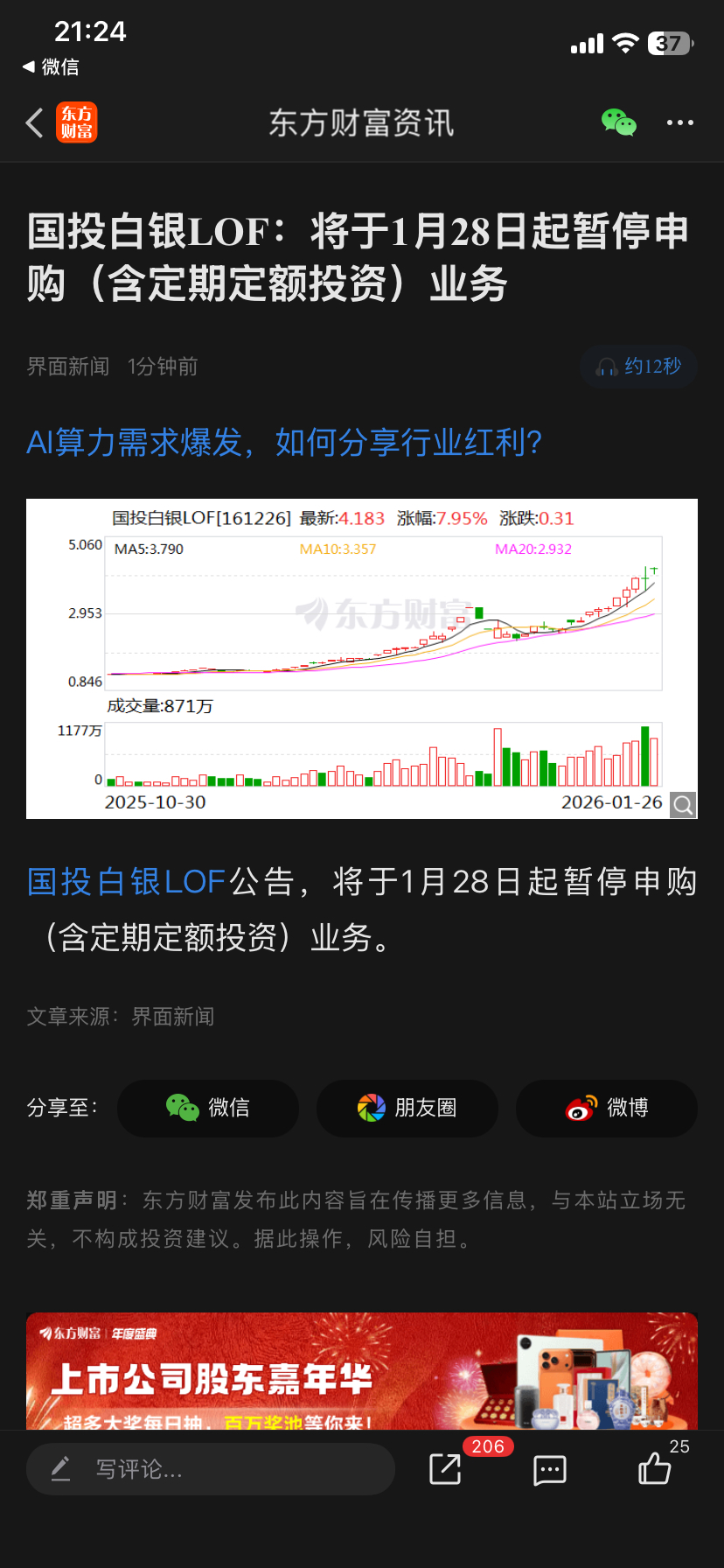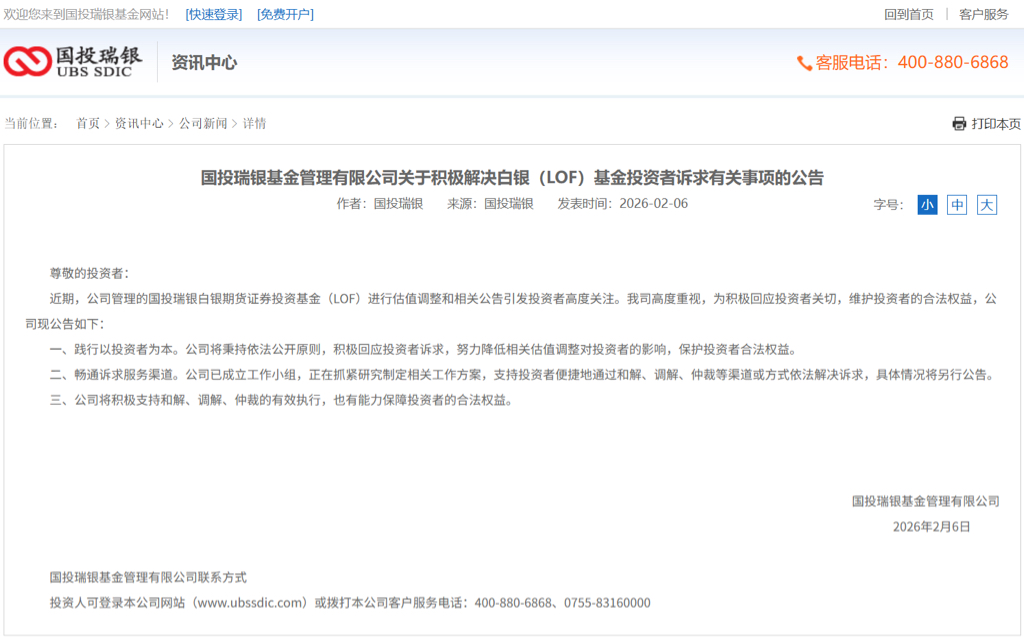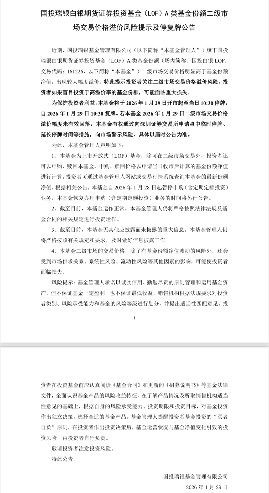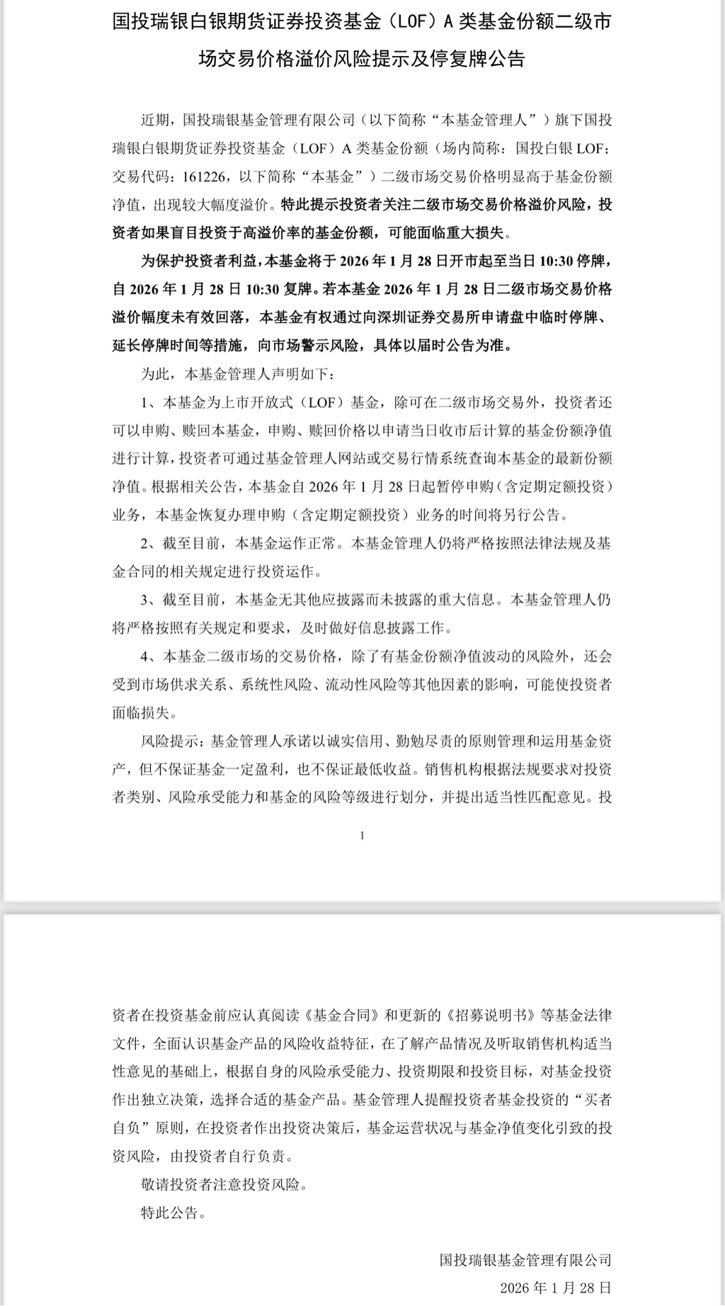 转:根据上海期货交易所1月21日收盘数据,白银主力合约(AG2604)单边总持仓量为30.22万手,国投瑞银一家持仓占比约9.93%,已经接近监管层的红线——单一公募基金持仓占比不能持续超过10%,否则将涉嫌操纵市场。这也意味着在目前情况下,该基金的规模扩张已无空间。