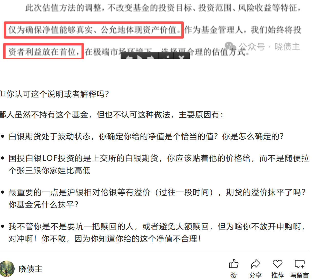 我不管你是不是要坑一把赎回的人,或者避免大额赎回,但为啥你不放开申购啊,对冲啊!你不敢,因为你知道你给的这个净值不合理!