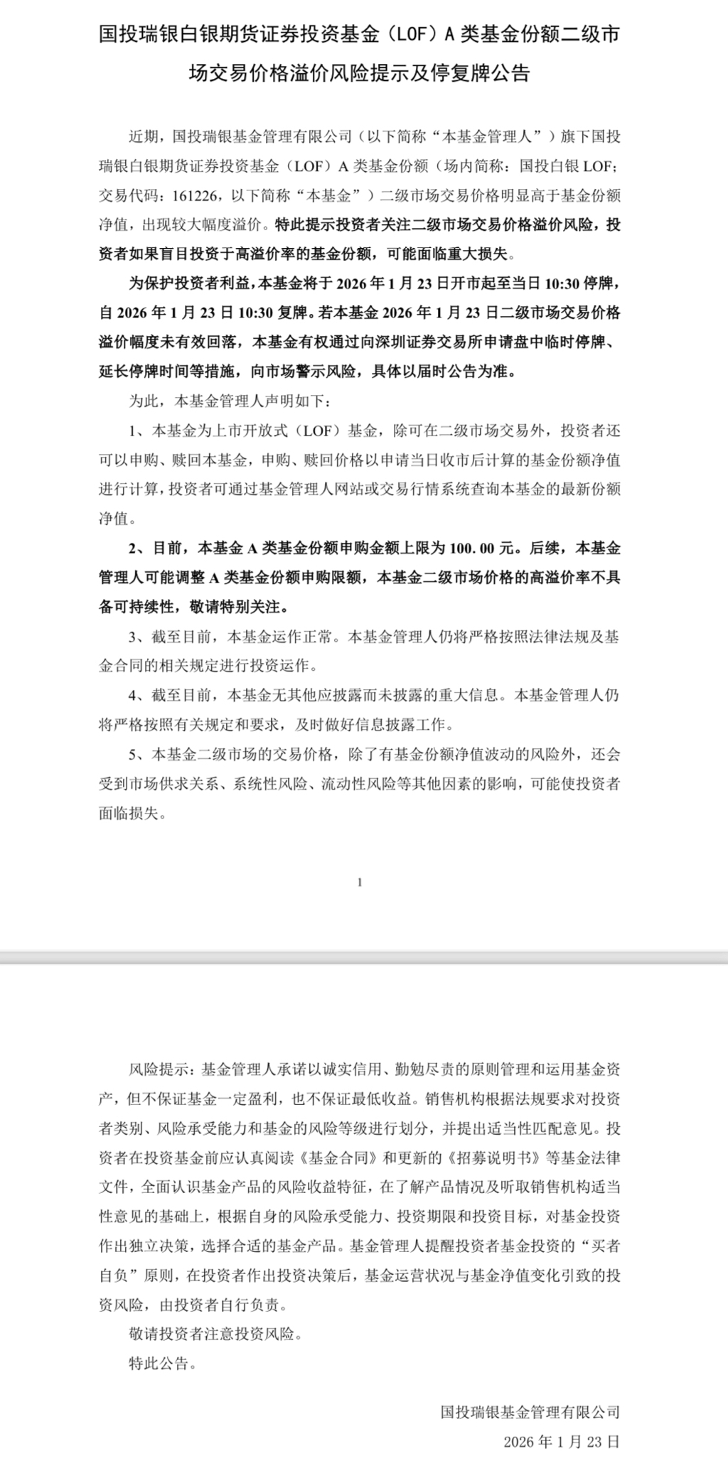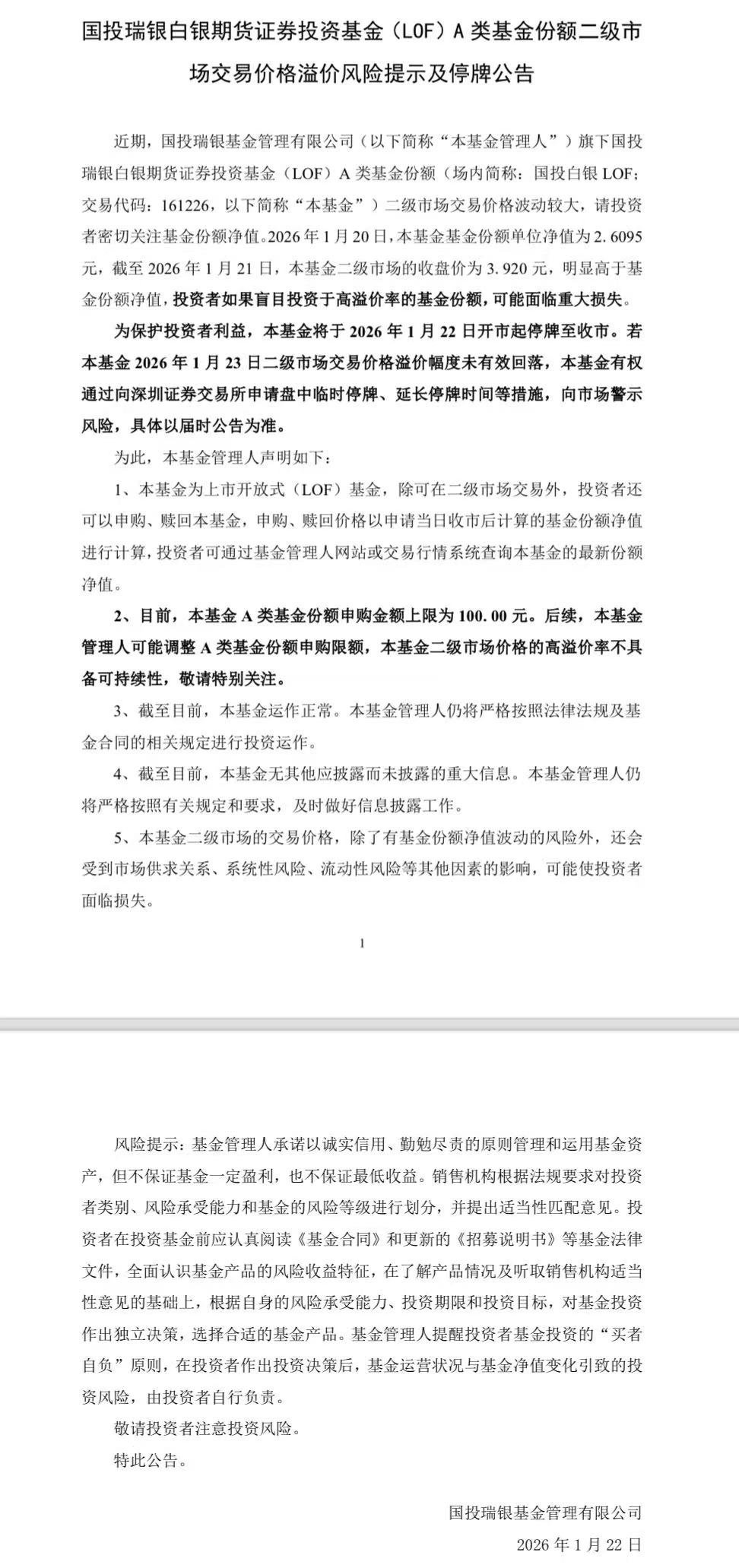 为保护投资者利益,本基金将于2026年1月22日开市起停牌至收市。若本基金2026年1月23日二级市场交易价格溢价幅度未有效回落,本基金有权通过向深圳证券交易所申请盘中临时停牌、延长停牌时间等措施,向市场警示风险,具体以届时公告为准。不让玩了么,公司这么负责的
