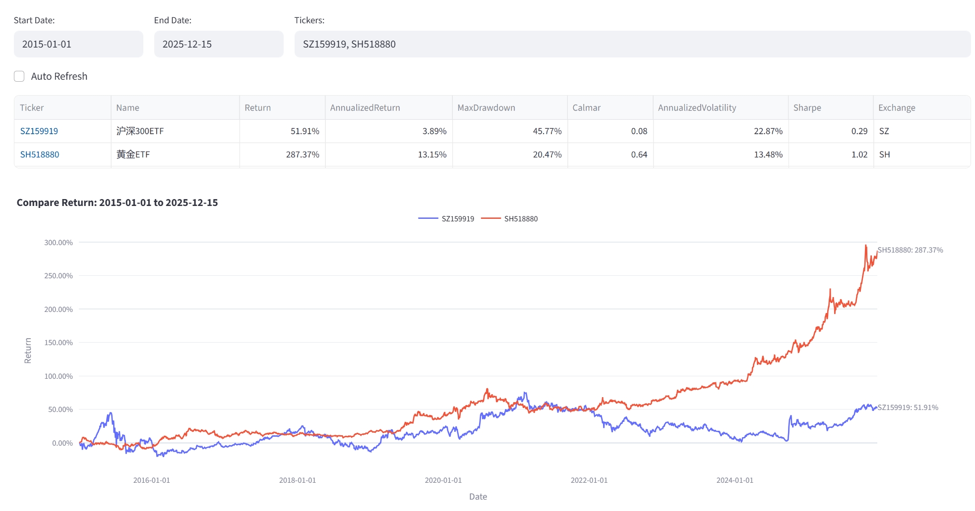 2015年1月1日至今,黄金年化收益13.15%,沪深300收益率3.89%(前复权)