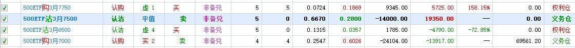 5张7000购+7750购,今天收盘价是0.9450元+0.3950元,组合平仓支出为0.55元,5张共支出2.75元,