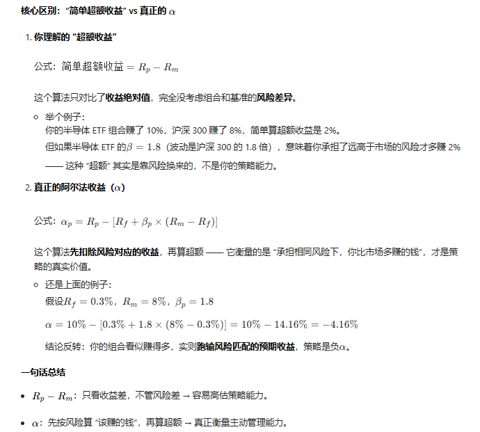 其中β为组合面对指数波动的敏感度;α为扣除β对应的市场收益后,策略自身创造的超额收益。这点与“时代的β与个人的α共振期全力以赴”还有点不太一样。