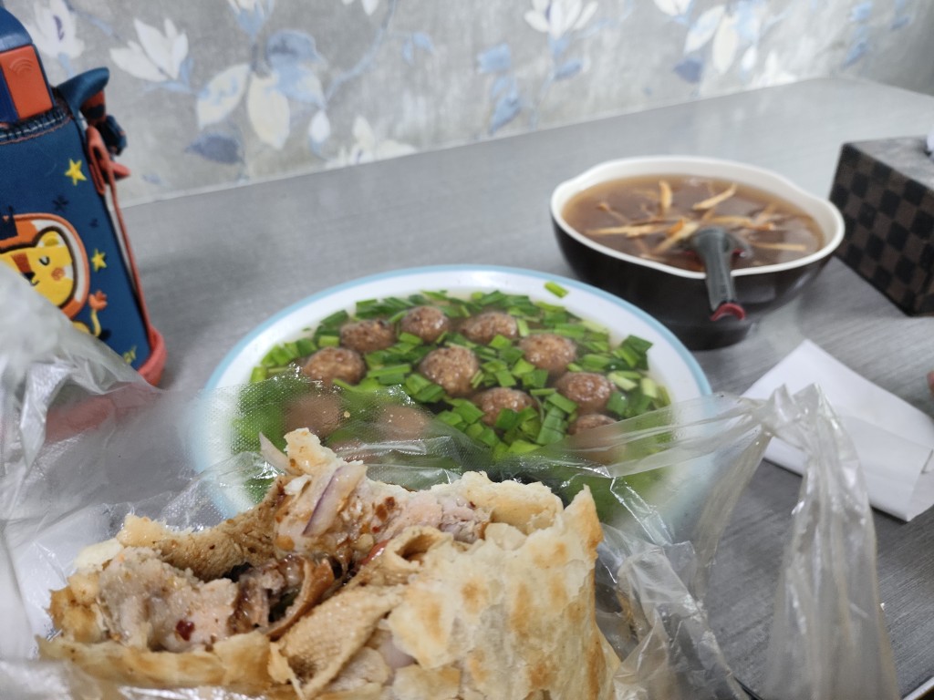 这家店只支持外带,店内没有桌椅,而且除了锅盔外没有其他的吃的。但是跟他紧挨着的另一家店,卖一些汤粥之类的,而且他家的院子里还有房间里都有桌椅。于是我在这家店里点了一份丸子汤和一份红薯甜汤。丸子汤就是萝卜丸子用酸汤煮的比较开胃,一份只需要5块钱。至于红薯甜汤,我不知道他怎么做的,上面有一些条状的地瓜干,也只要三四块钱。我和孩子两个人,一个锅盔两碗汤,都没有吃完。