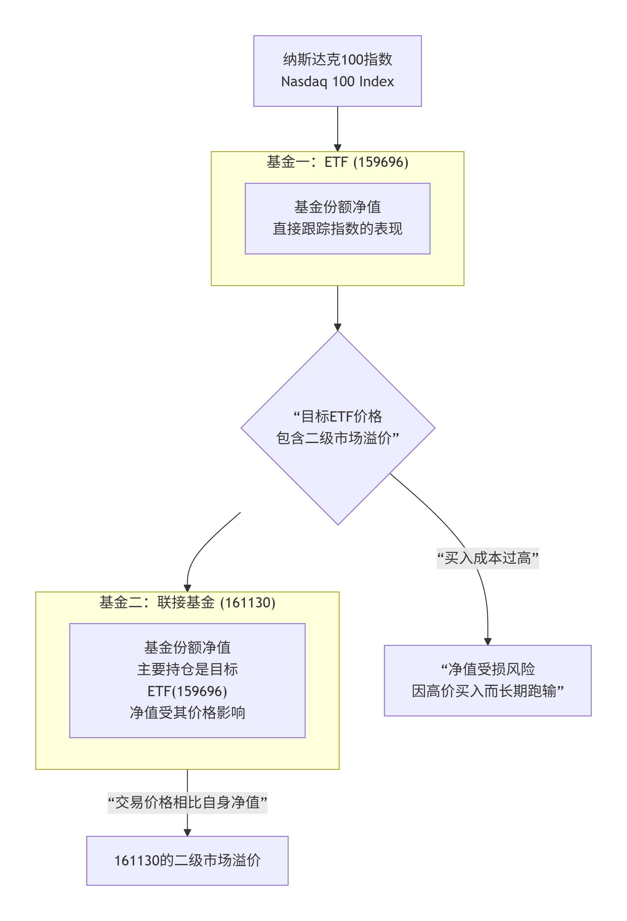 学习了,怪不得161130的溢价相对比较低,因为到这一步的溢价已经是个再次嵌套的溢价。溢价倒也没有叠加。161130的净值是按照持有的159696的净值计算的。主要问题是159696场内溢价时,申购金额能买到的159696份额偏少了。