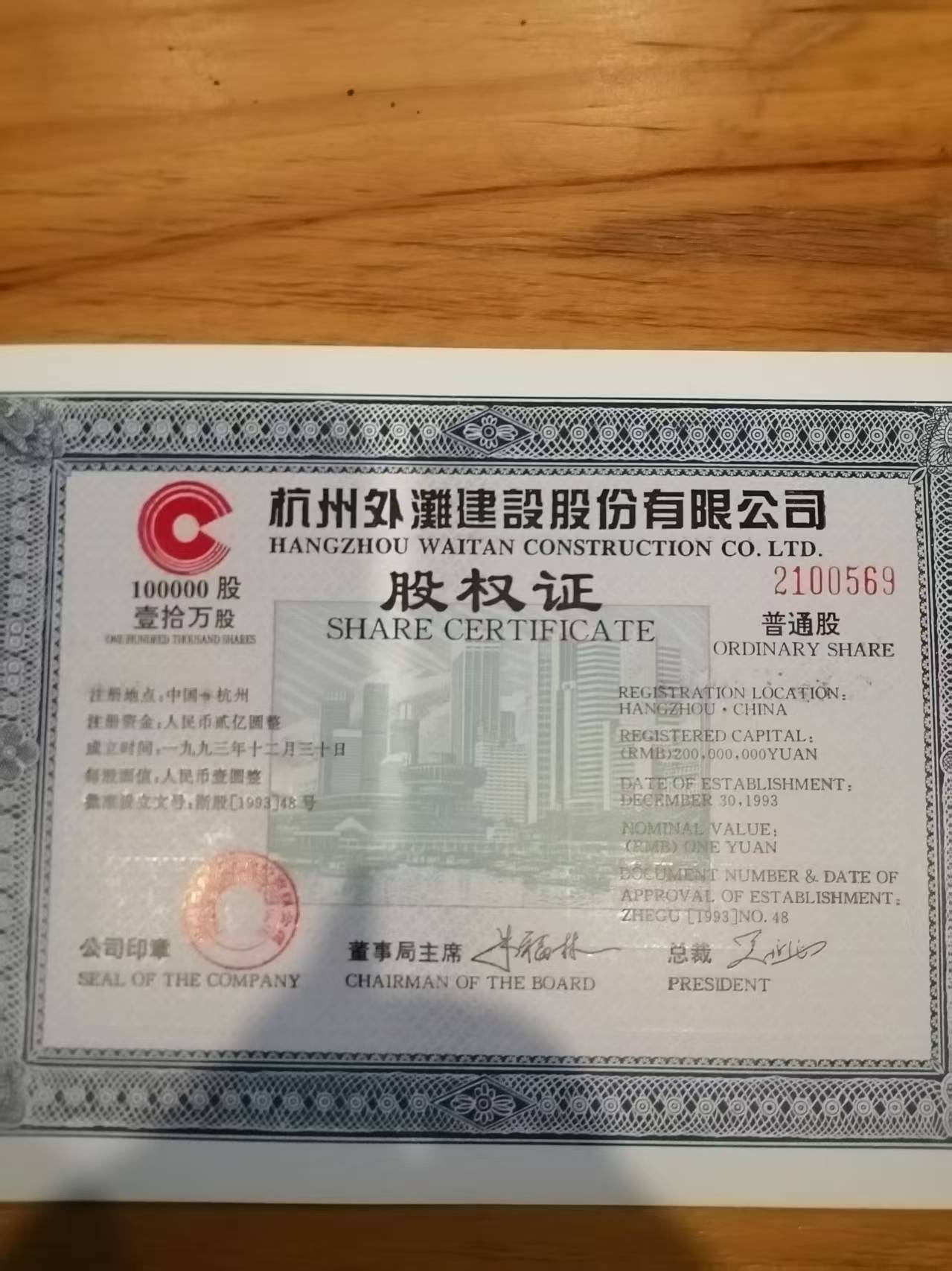 杭州外滩建设股份有限公司,股权证,具体见附件。