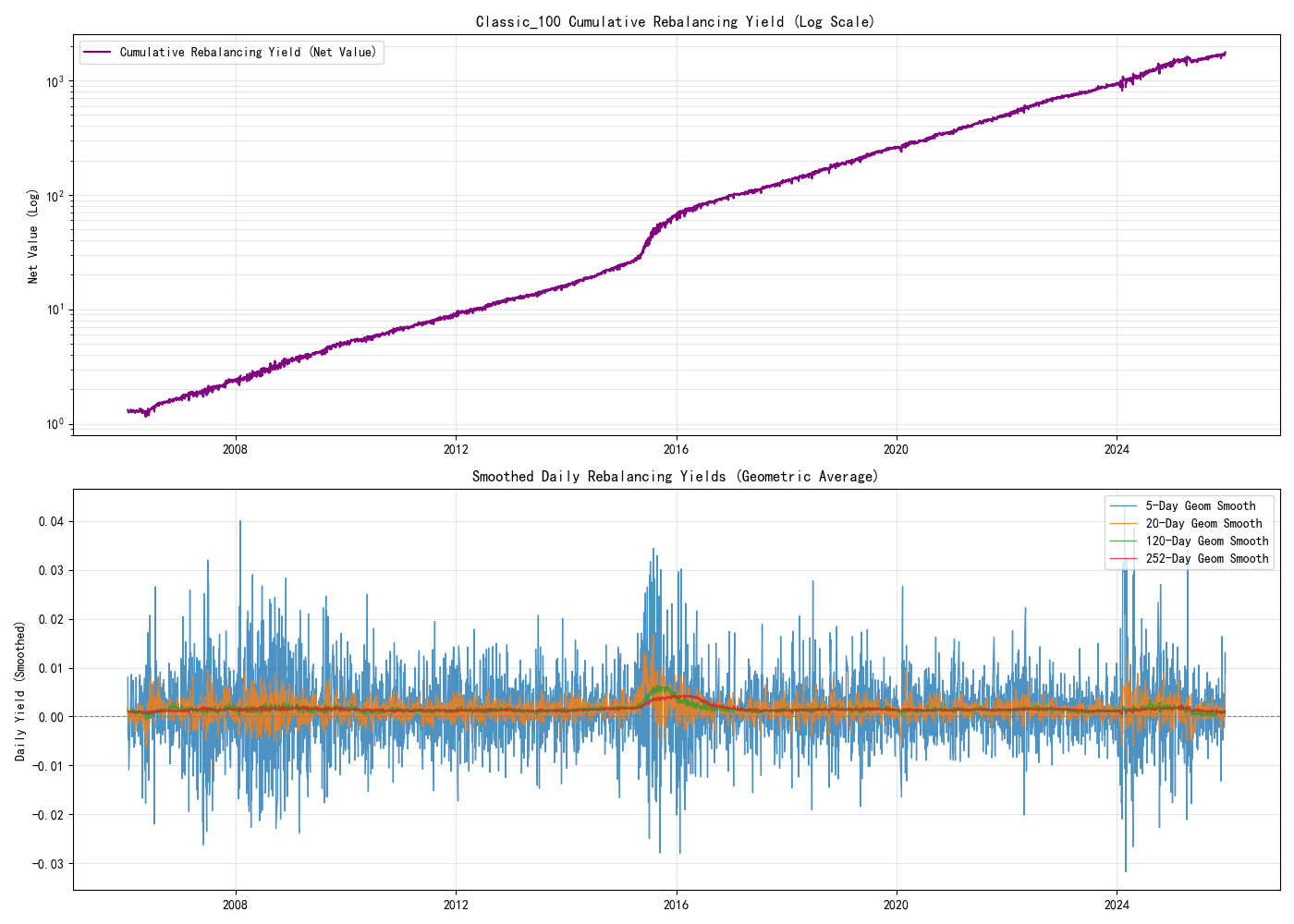 图好得有点不可思议,最让我吃惊的是这个调仓收益率居然基本固定(让Gemini推导了一下,理论情况下这种反射布朗运动的再平衡收益率应该正比于波动率的平方,细节还有待考证)