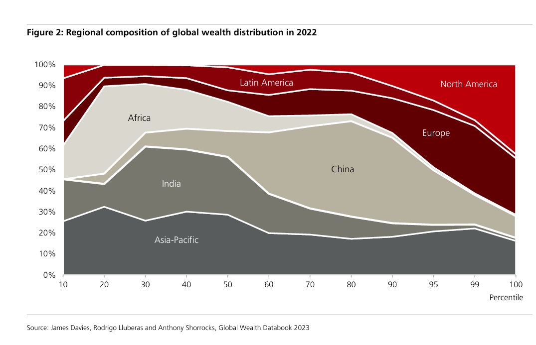 最近因为斩杀线看到的一个很有意思的数据,也可以一并来这里讨论,据说是瑞银2022的报告: 这个数据1)并没有对比物价水平2)这是三年前的数据所以体感上现在的中国数据起码要乘以,拍个脑袋,3起码吧当然这个数据主要体现的是美国从20-50%中间那可怕的断档,斩杀线果不其然这幅图翻译过来是,图 2:2022 年全球财富分布的区域构成百分之百