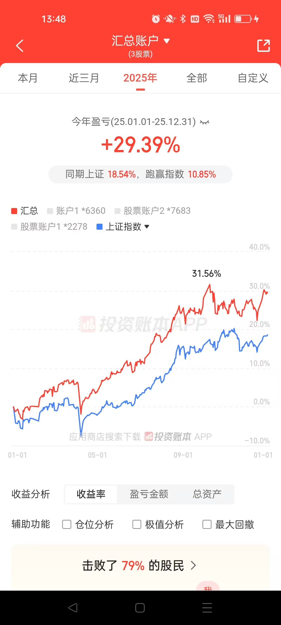 25年收益29%,在本论坛应该是不入流的水平,自我感觉最差的月份是10月,10月9日,满仓的有色、储能票大涨,第二天开始大调整,10月20日大调仓,然后有色储能迅速反弹,本来应该大赚的一个月却造成全年最大亏损,10月9日盘后收益成了全年最高点……