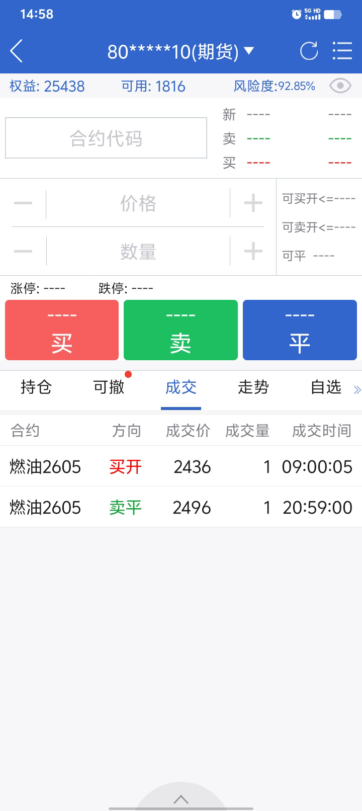 按计划挂2496出油,2452进,正430块。夜盘大跌。挂2436买入。感觉大家都在涨,就油最弱了,忍一忍,醇之前也很弱,最近也涨了200点,等待油的200点,呵呵。