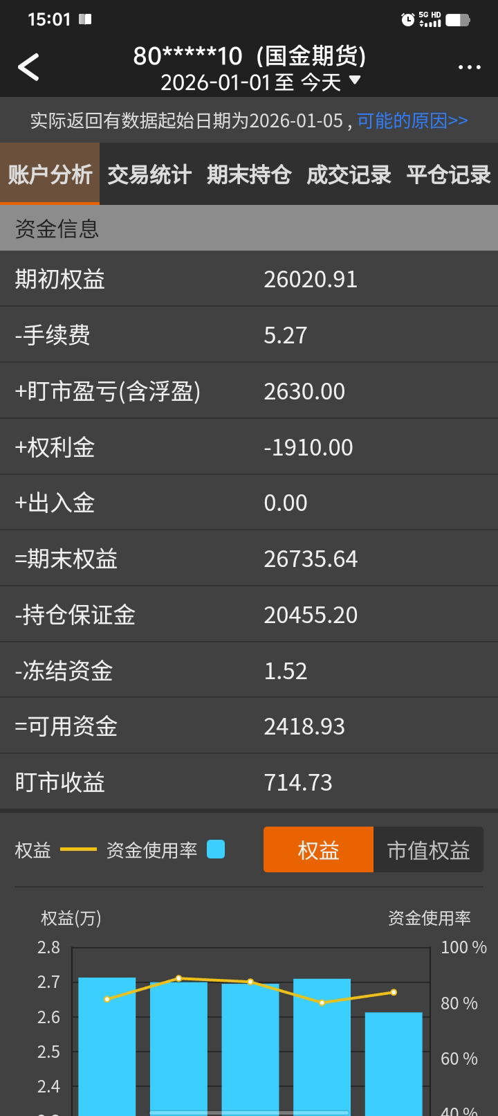 按计划,燃油比一开始的计划低了点,捂脸。2620出油,以2434计,正1850块。铁权26.3出,20.2进,正600块。期末正1.08万。仓位降了很多了,后续单个品种的合约价值10万为限,也就是燃油大概4手,铁矿和油的话,最多1手加1手权。控制仓位,不轻易加码亏损部位。不算纯趋势。