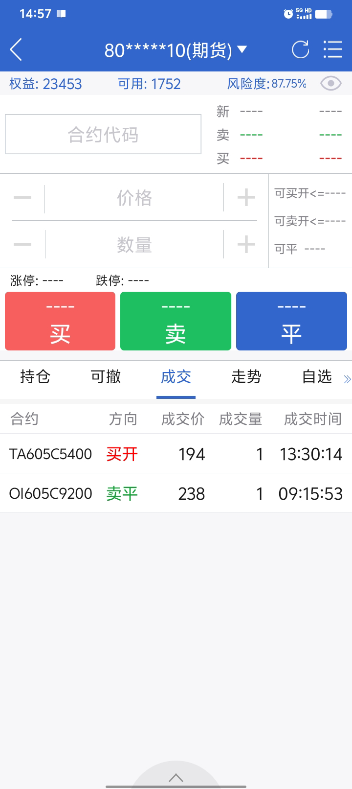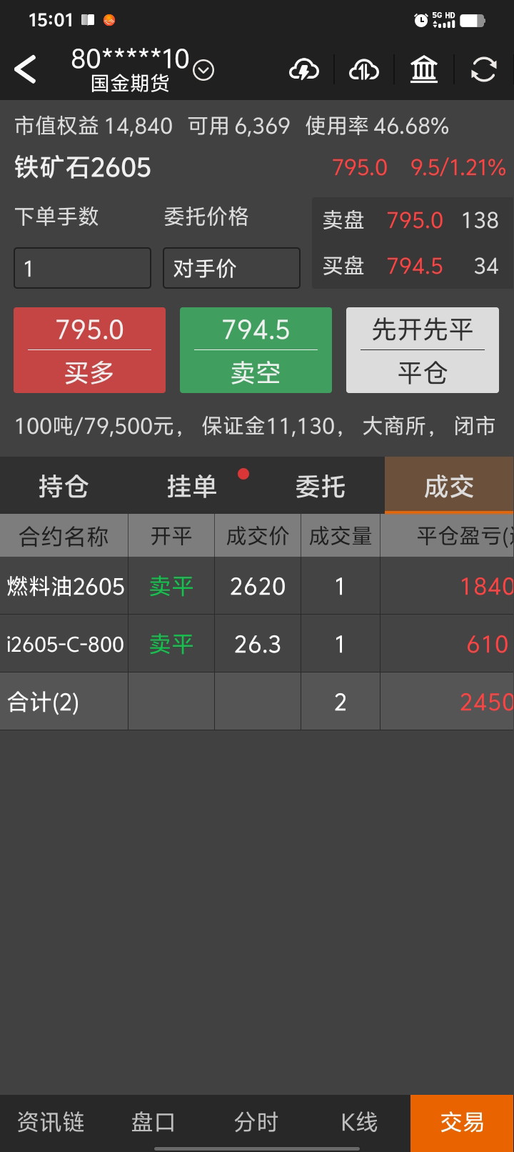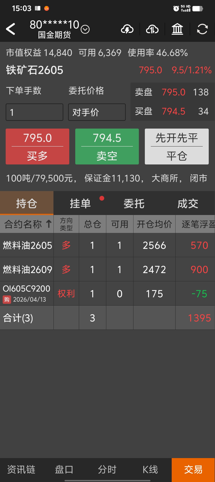 按计划,2581出fu09,2472进,正1080。2633出fu05,以2529计,正1030。这两天终于牛了一把。2566重入1手,存2566/2501/2434三手。pta再观察一下,不行就砍了,菜油权再跌点也砍了,进一手菜油。后续还是铁和油,铁做趋势,菜油做网格,fu两个都做,不同合约来区分,趋势近一点,网格远点,互相配合,呵呵。
