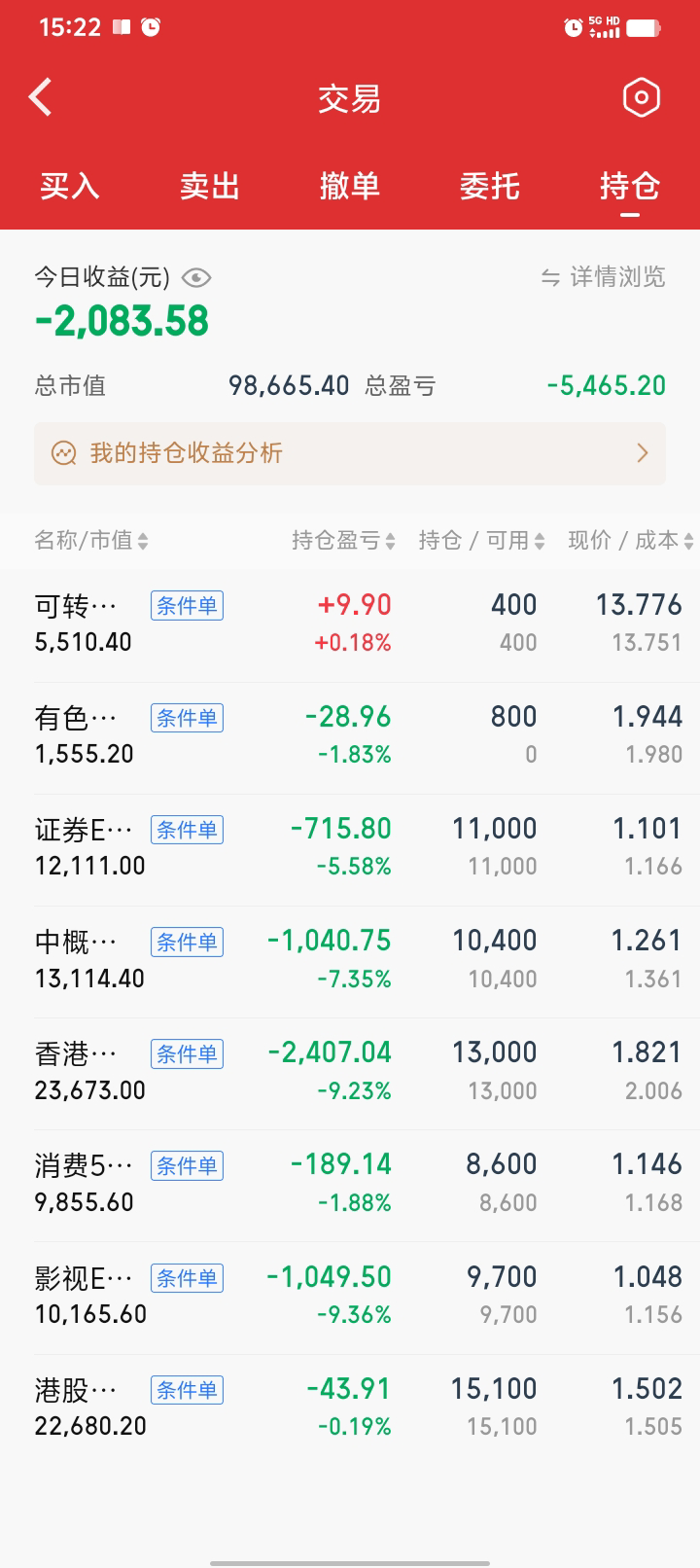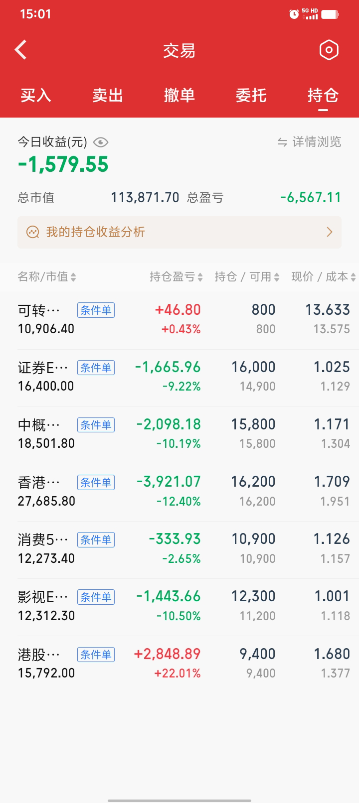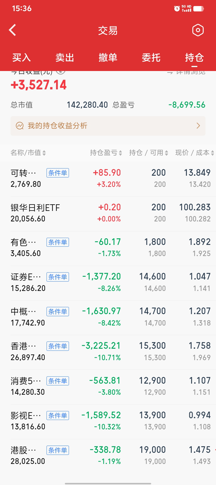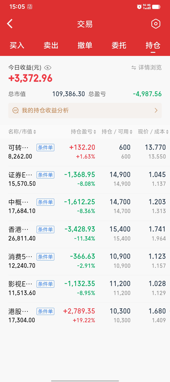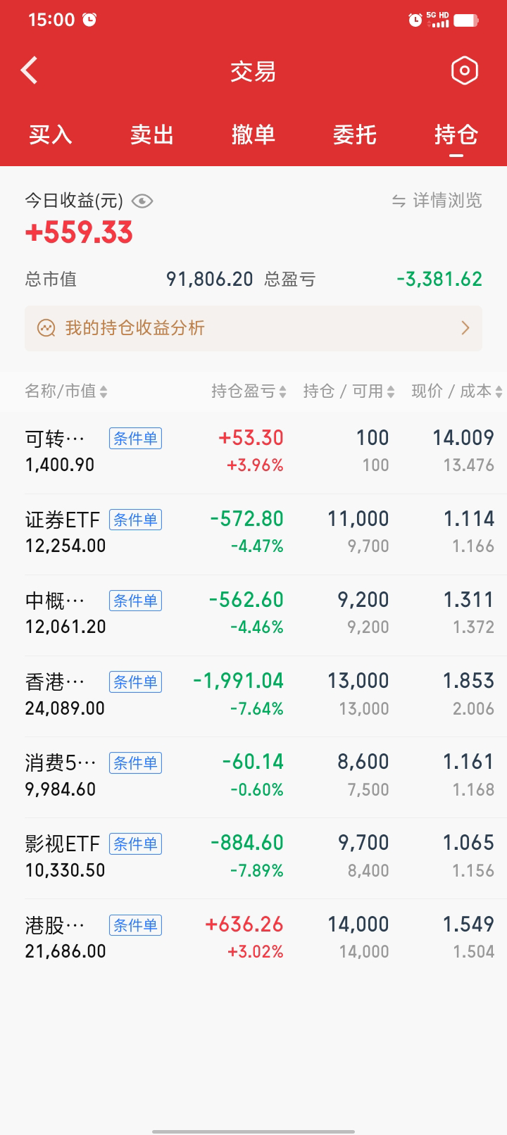 继续网格,增加380刷一刷,呵呵。中午计划买点中金,挂了33.91没成交又撤了,还是有点舍不得手续费,捂脸。不过中金确实比880抗跌。570红了,最近表现好的是570和050。消费50也不错,虽然波动不大,也快解套了。090和880最差了,熬一熬吧。