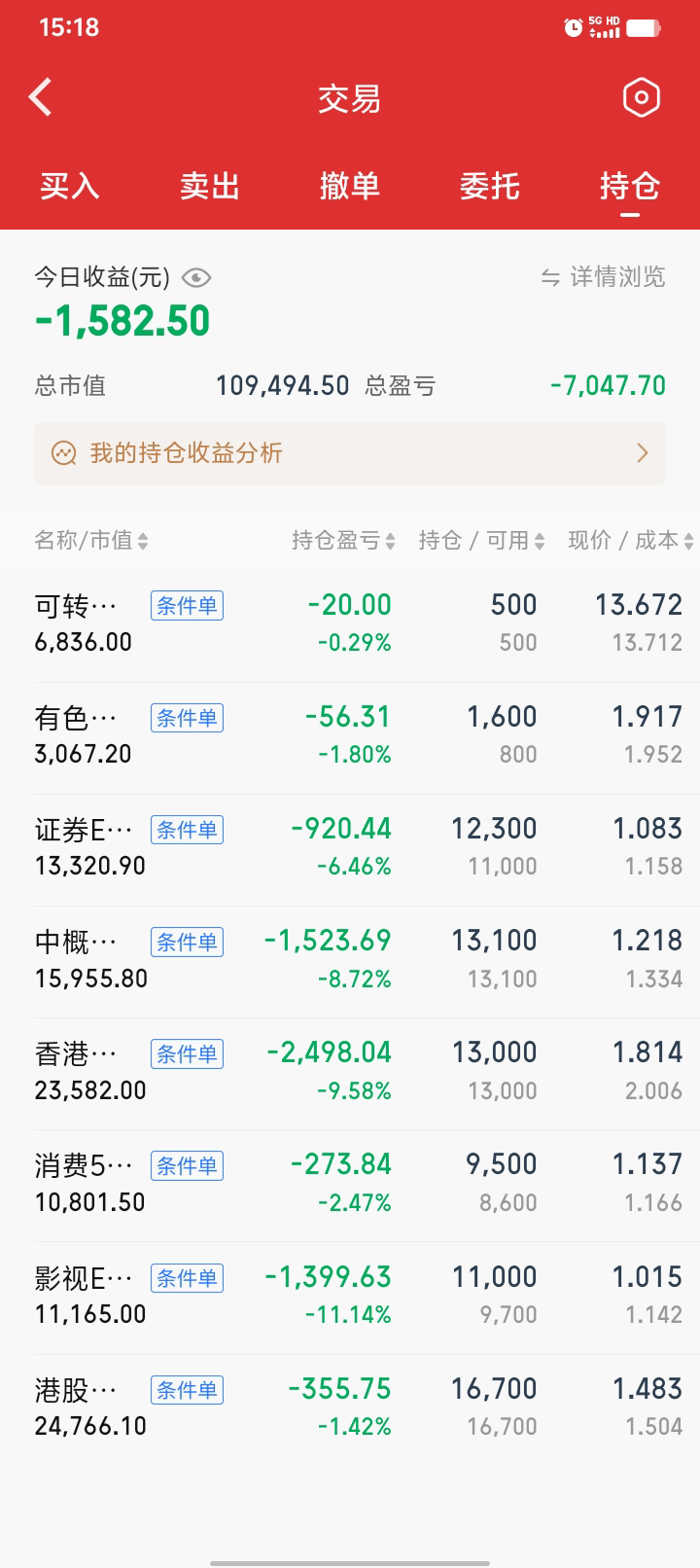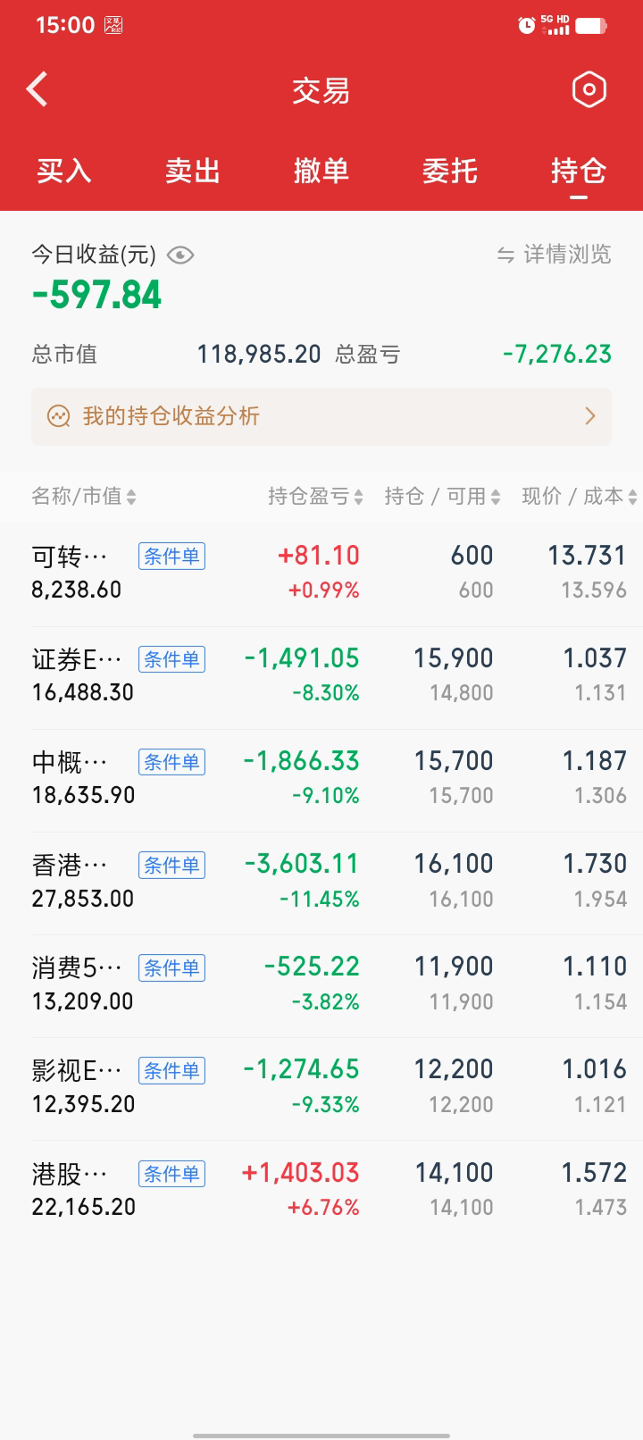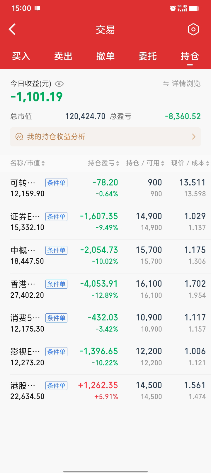 今天超大亏。。。5个ETF场内基金,2笔卖出,4笔买入。。。只有红利低波红,其他都暴跌啊。。。。