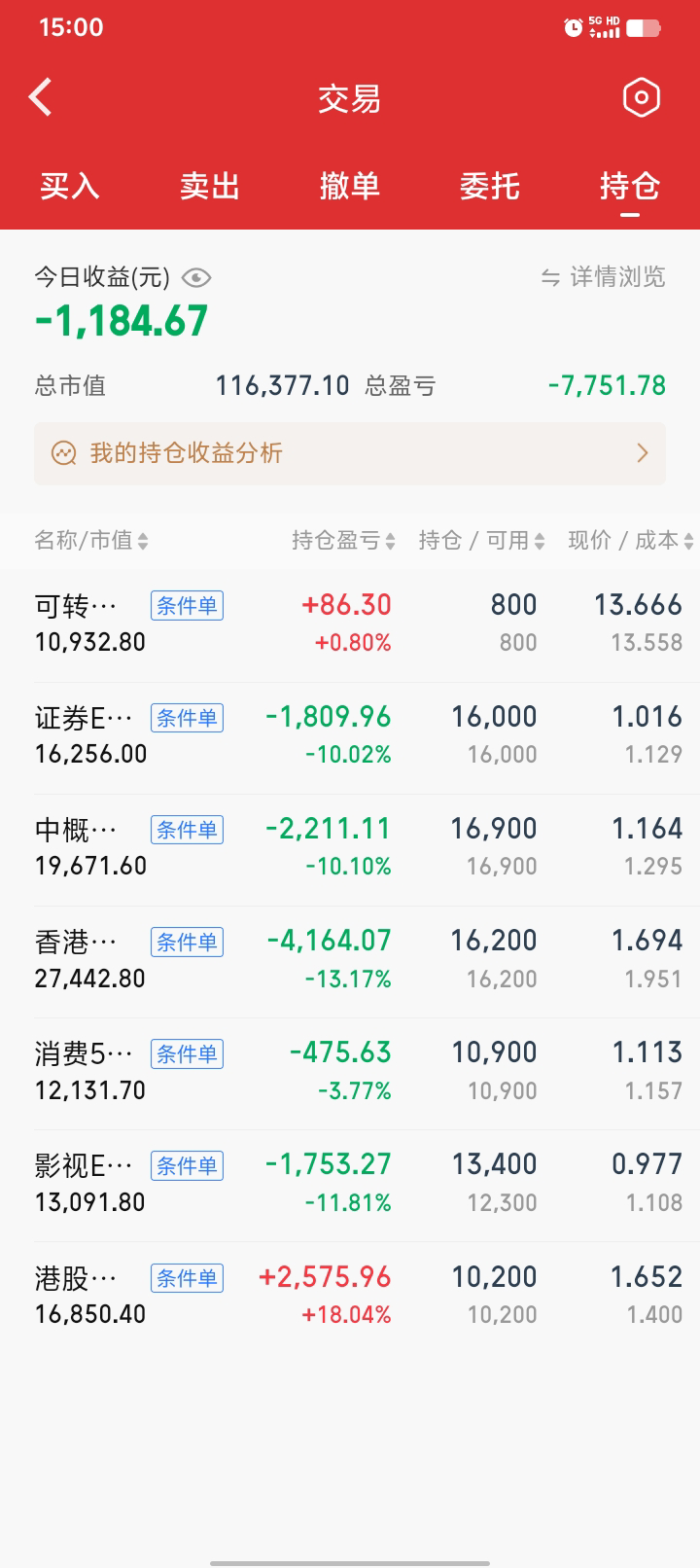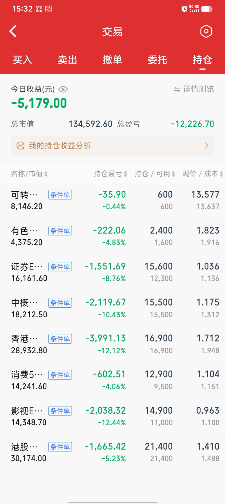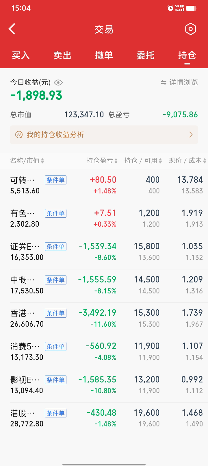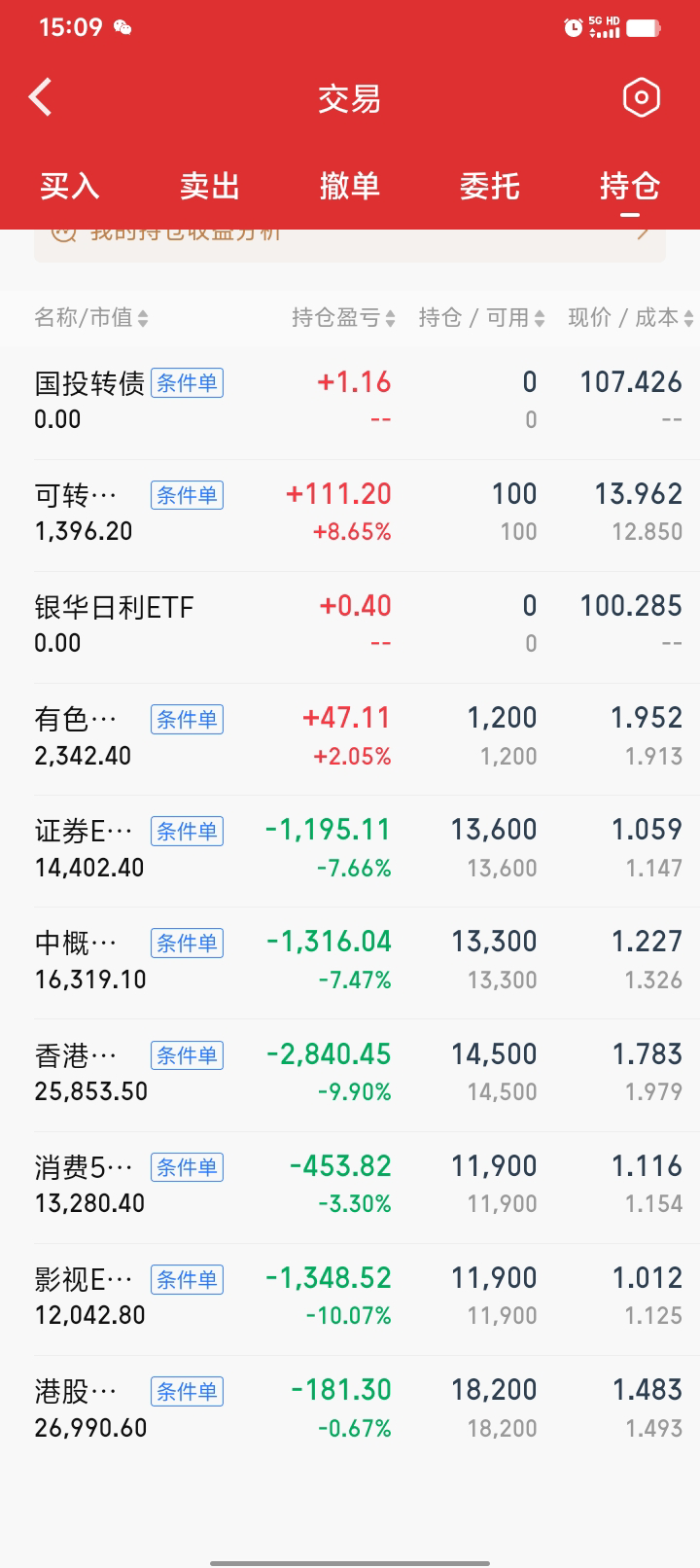 今天超大亏。。。5个ETF场内基金,2笔卖出,4笔买入。。。只有红利低波红,其他都暴跌啊。。。。