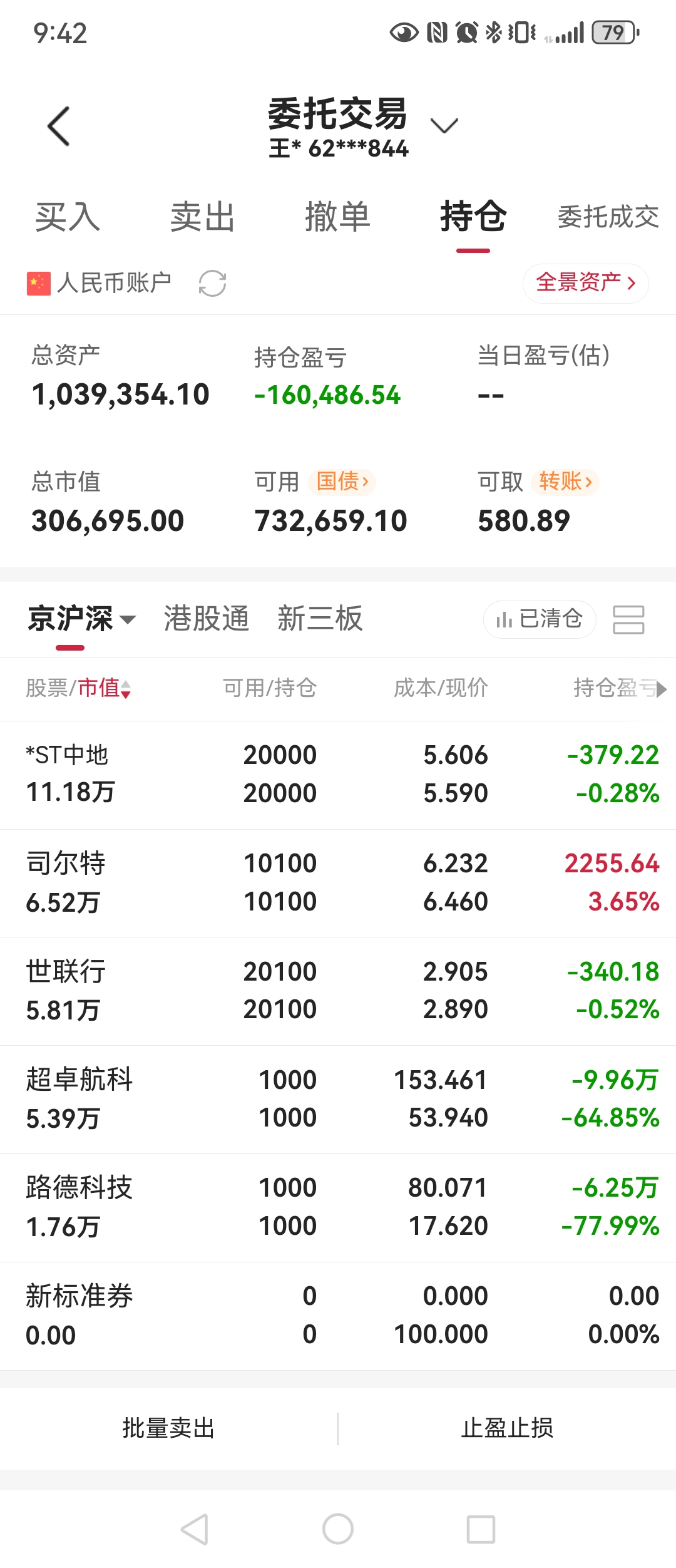 3、司尔特 成本价6.051, 现价6.42, 亏损1.24%,仓位13%