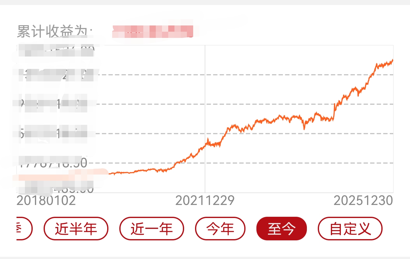 而拉开我的历史收益图,不管是历史收益还是当年收益,收益曲线都是一条缓慢向上的曲线。