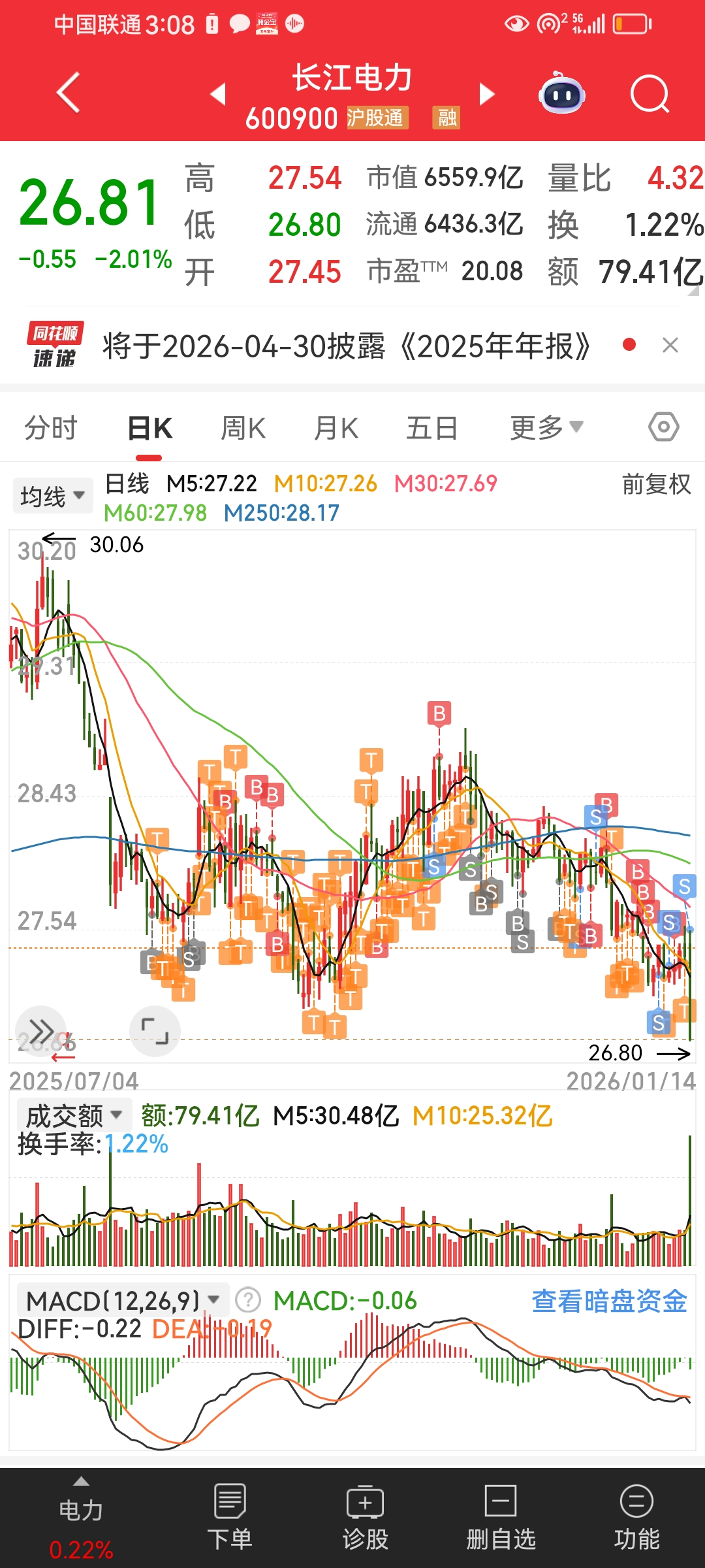 今天早盘卖掉部分的长江电力幸好没有接回来。其实我大多时候都是跌个一毛多左右就回接回来。下午也是幸好在27.09左右分两次全部清仓了。总的来说,长江电力从去年没亏。微赚