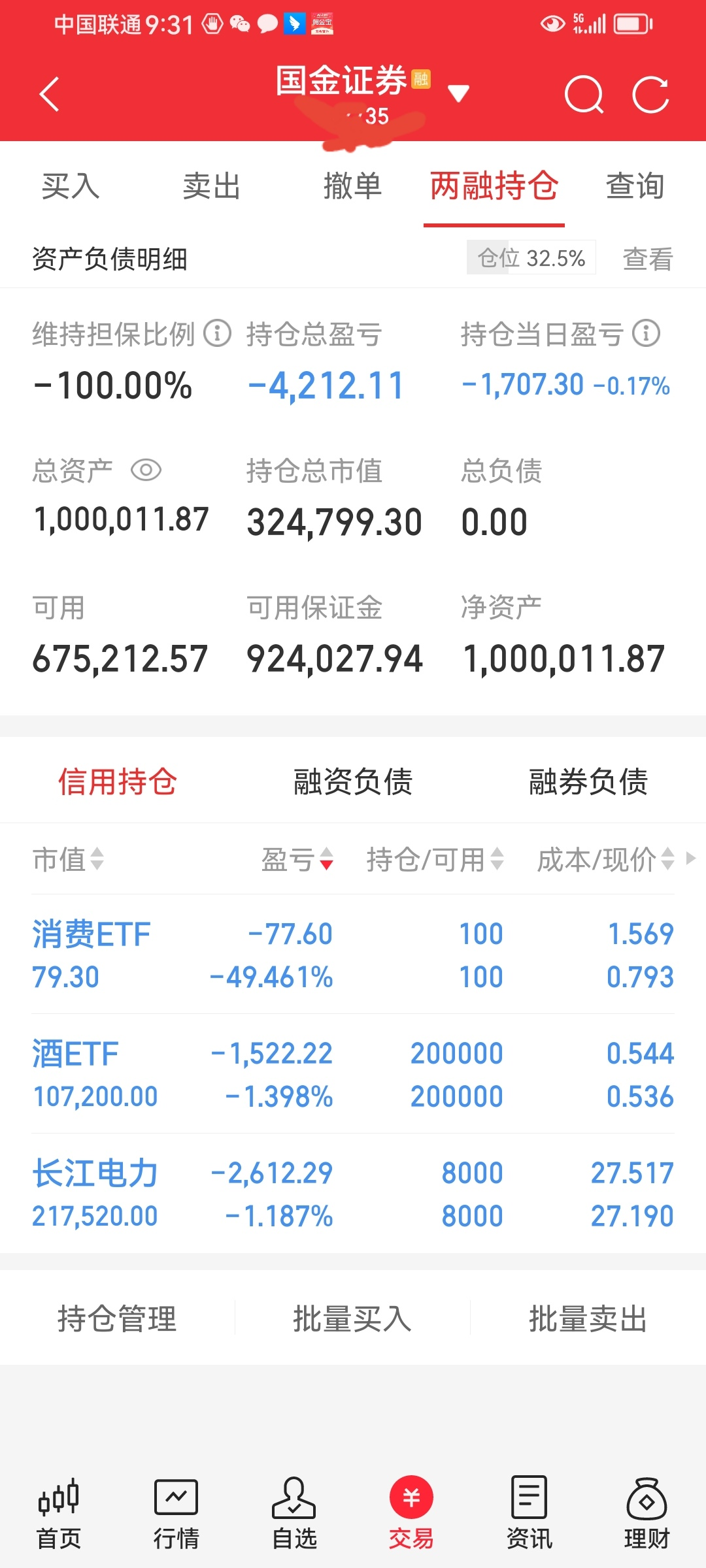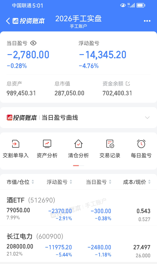 说到这周,长江电力好在早点清掉了。只是酒ETF微加仓。加上不断做T。目前成本是0.536。比之开始的0.544,还是做了点下来。 如果按年初买入一直不动,大概已经输了近5个点了。下面是实际持仓情况到今天微赚平盘