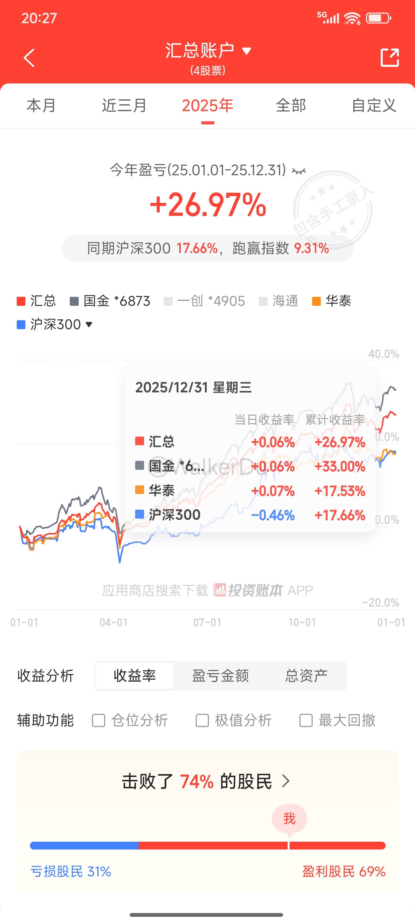 今天是25年的最后一天,下午逛公园时意外碰到了前所未见的很多小猫(可惜手机扔在车上了。。。),赶紧把随身携带的猫粮喂了它们,前后喂了八九只。猫招财,我感觉,这是个很好的兆头 ^_^ 展望2026年,我的目标仍然是在能力平庸且不断犯错的情况下赚钱,争取收益率超过沪深300指数15%。