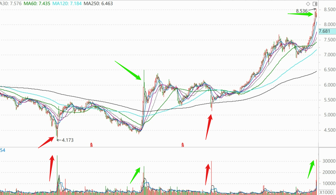 再看一下500ETF缩小图。短短2年多,就在K线图上留下了4个成交巨量痕迹。有意思的是,就是股价阶段性的重要位置。