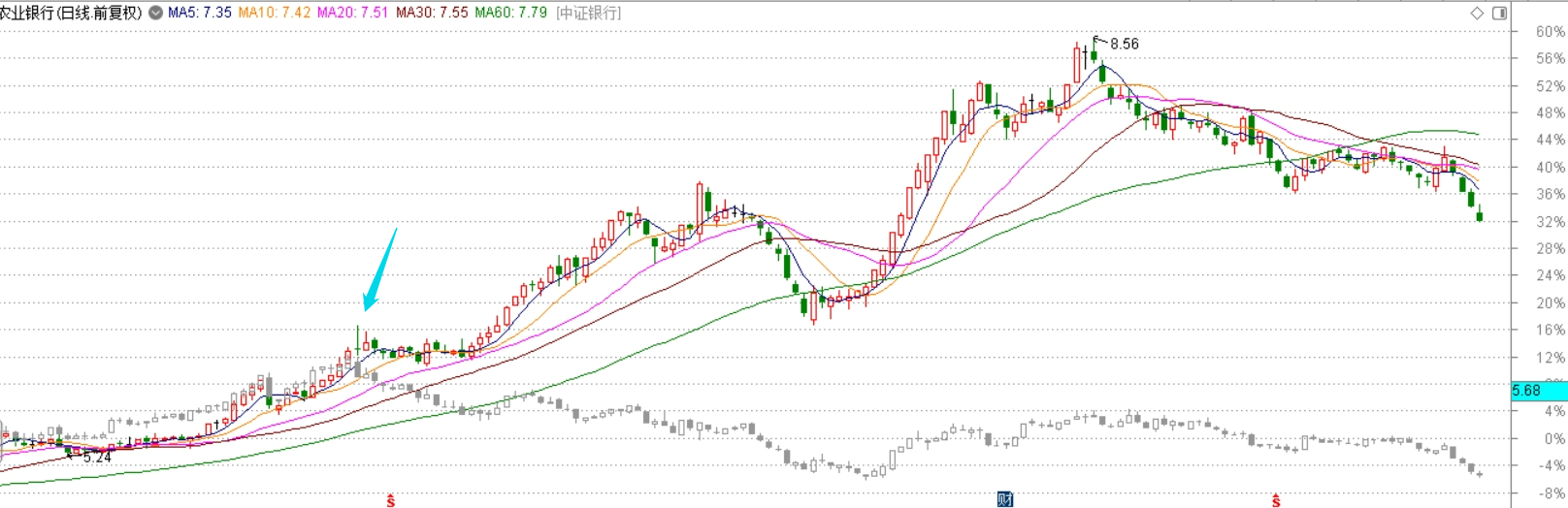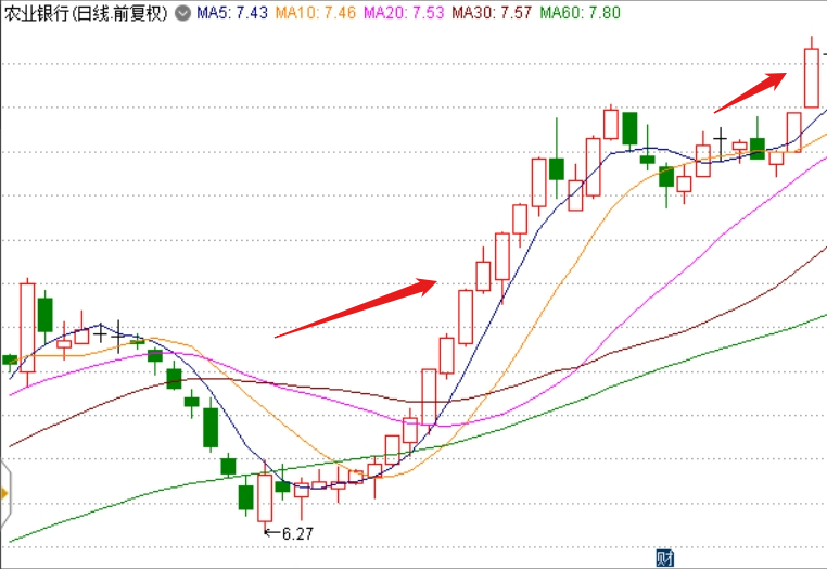 先放一张农业银行和中证银行指数叠加图。里面的蓝色箭头指向的是去年7月初,个股和板块指数分道扬镳的时点。整个银行指数不断下跌,而农行不断上行。