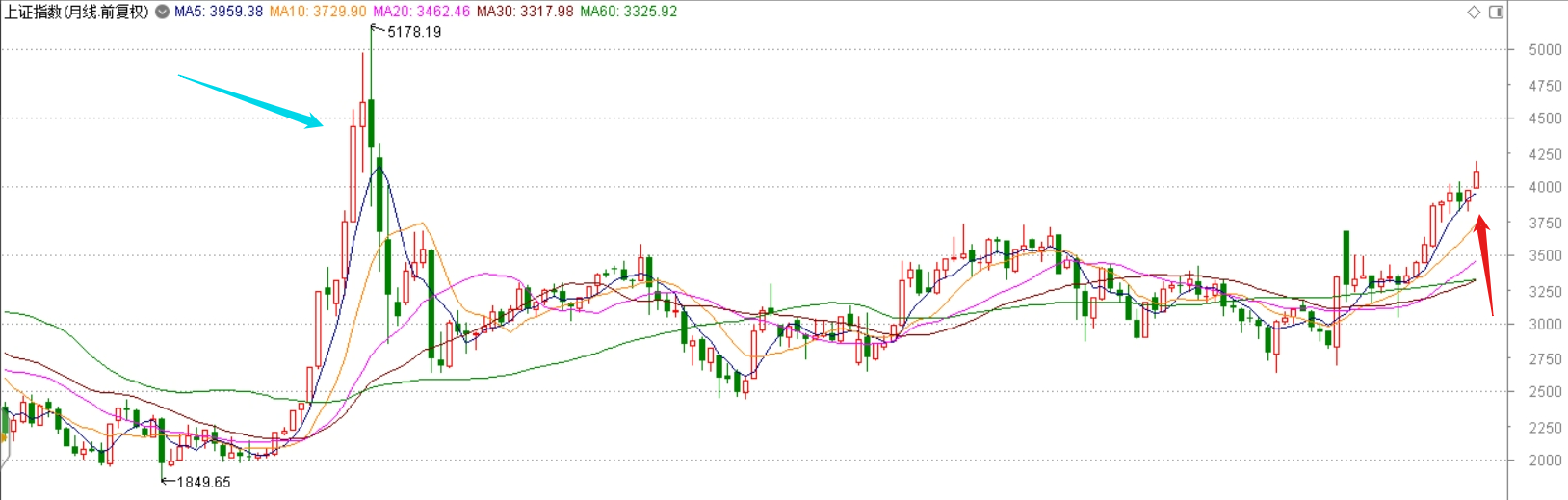 我再把上证指数月线图放上来。红色箭头就是当前位置。说白了就很简单了:此时此刻,多头看涨其实就是等待指数冲击蓝色区域还可以有接盘侠。而空头做的是:大概率站不住,落袋为安!因此,这里的成交肯定很活跃,能否分出胜负并不容易。