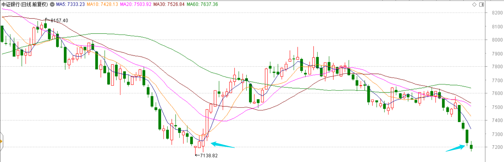 紧接图二的是后续走势图。和强者恒强截然不同了,可能出乎大多数人意料的是,浓眉大眼的国有行居然也“叛变”了,整个均线系统完全从多头变成了空头。