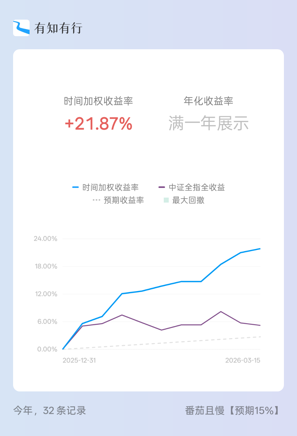 本周收盘,番茄组合2026年收益率:21%【当年最高21%、最低0%、最大回撤0%】。