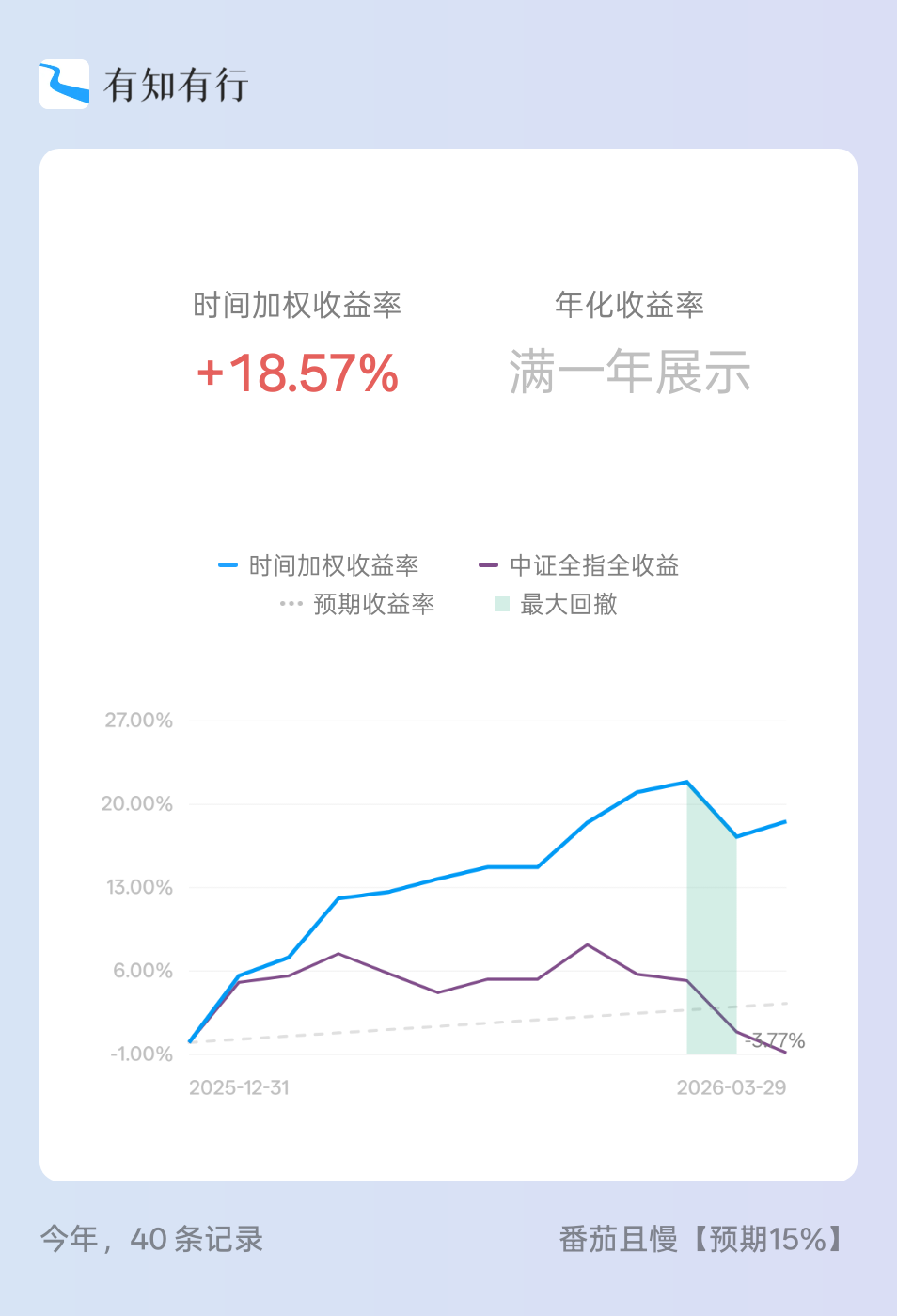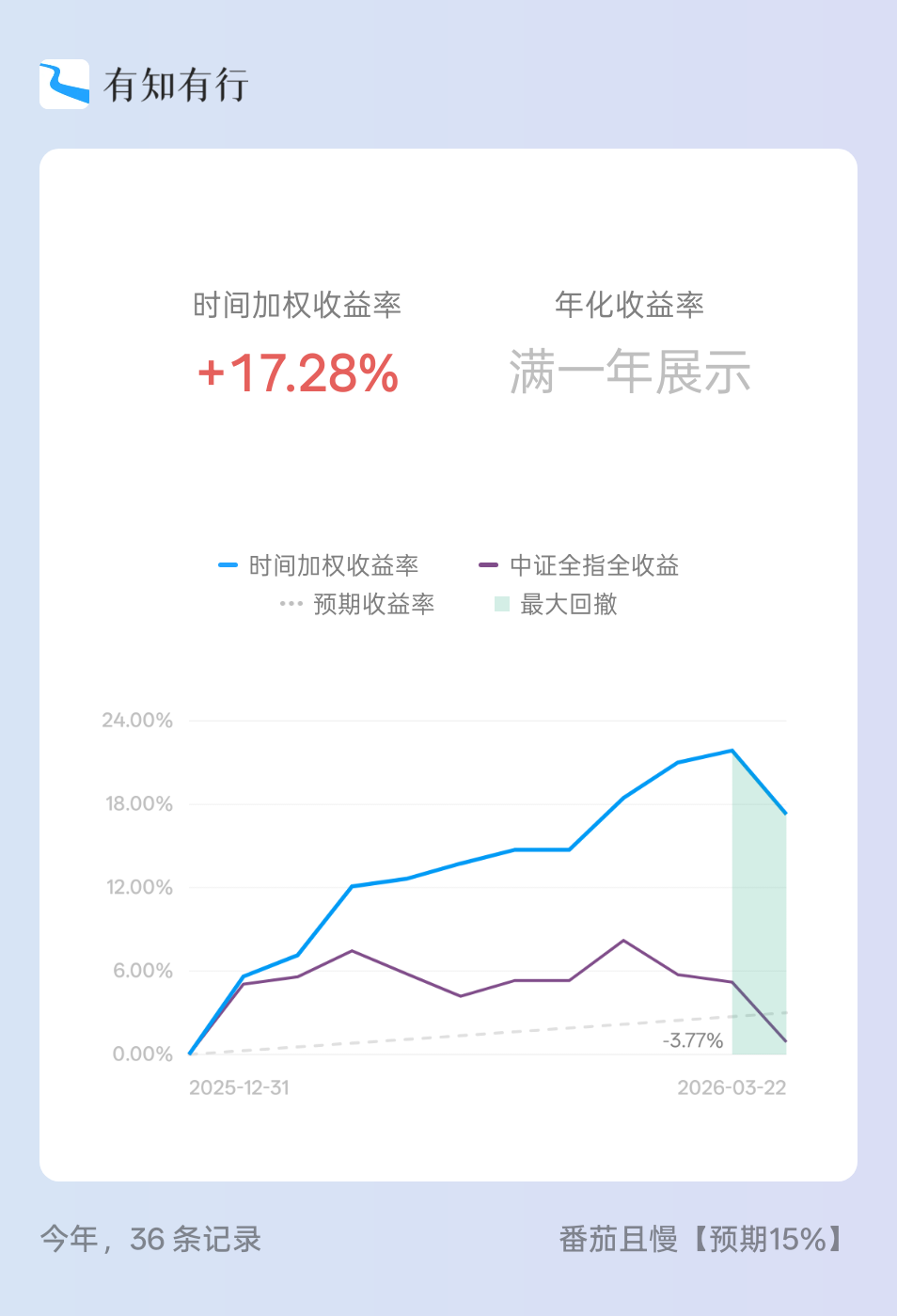 2026.3.27收盘,番茄组合2026年收益率:19%【当年最高22%、最低0%、最大回撤4%】。