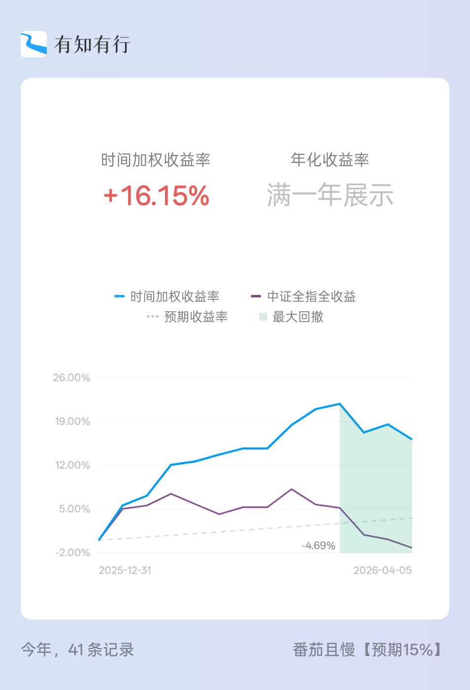 一季度收盘,番茄组合2026年收益率:16%【当年最高22%、最低0%、最大回撤5%】。
