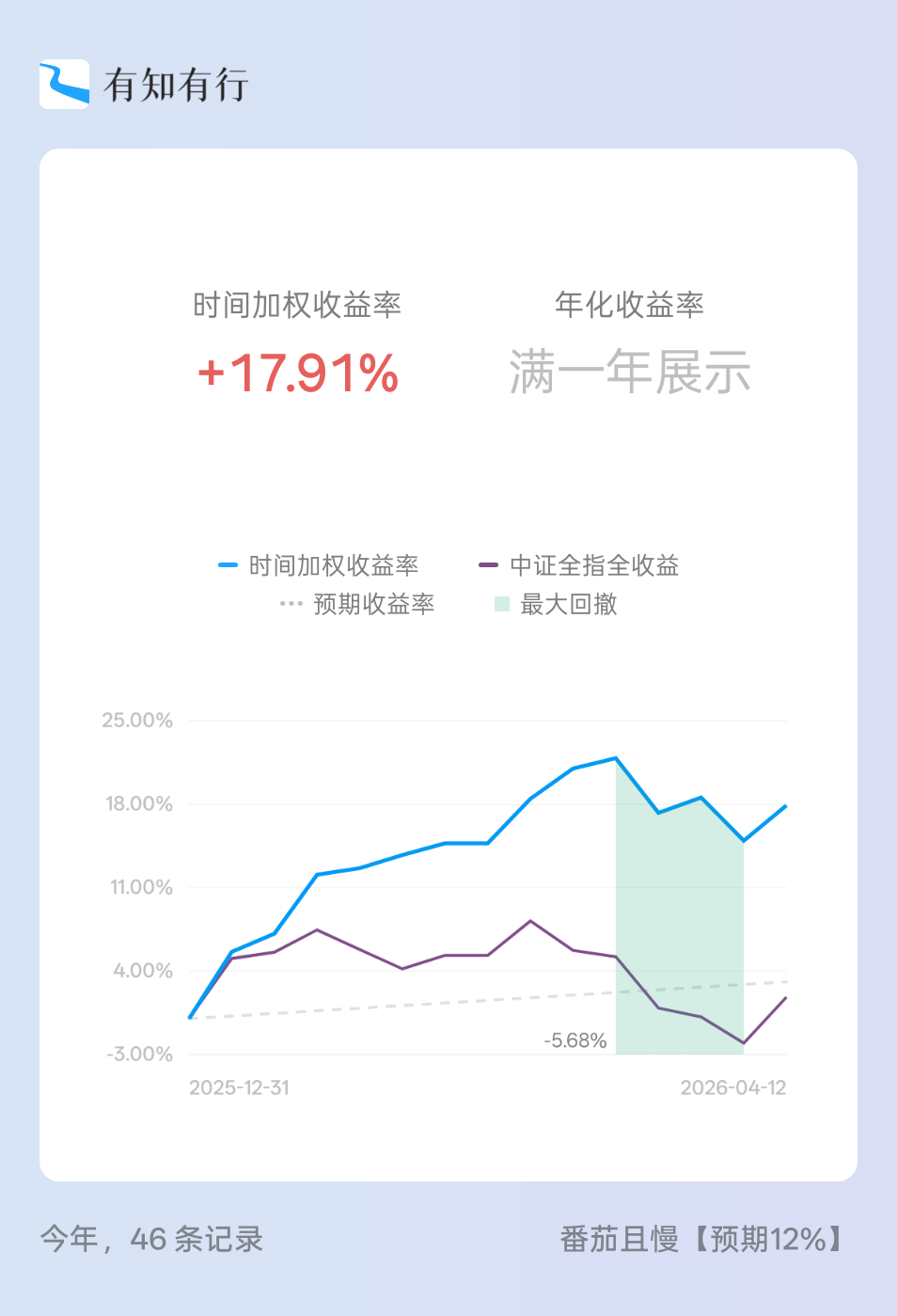2026.4.17收盘,番茄组合2026年收益率:19%【当年最高22%、最低0%、最大回撤6%】。