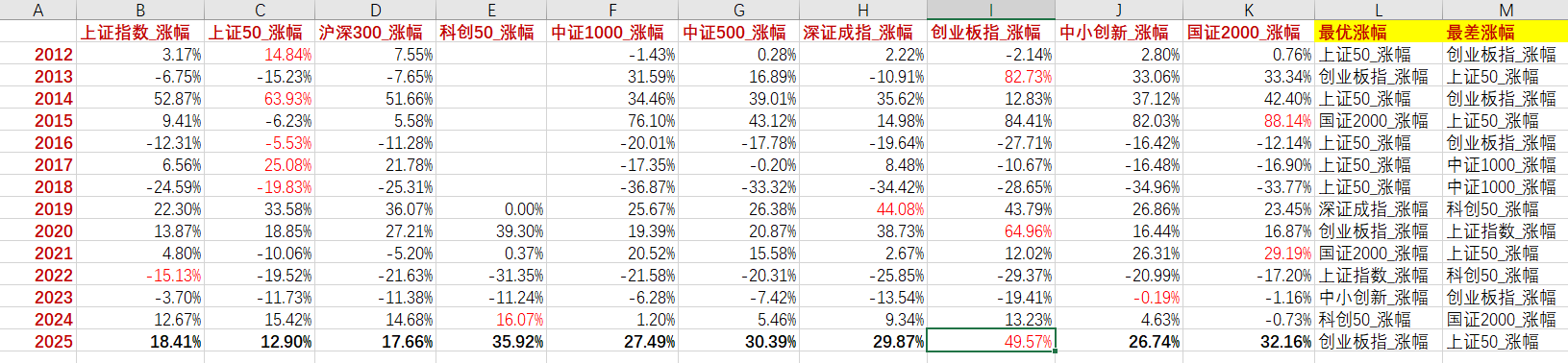 2025年已收官,不论有多少收获还是有多少遗憾,毕竟是收官了,我们还是总结过去,指导未来。基于tushare,做了历年宽基指数涨跌幅统计并保存excel,多少还是能看出一些规律。比如早些年大盘股强的年份占比很高,而近些年小盘股走强以及大小盘轮动风格更明显;而整个十几年来,某一年的最优指数,也可能是下一年的最差指数,不看数据只是遵循强者恒强,追涨杀跌的话,还真是容易被割。统计如下,规律自查。