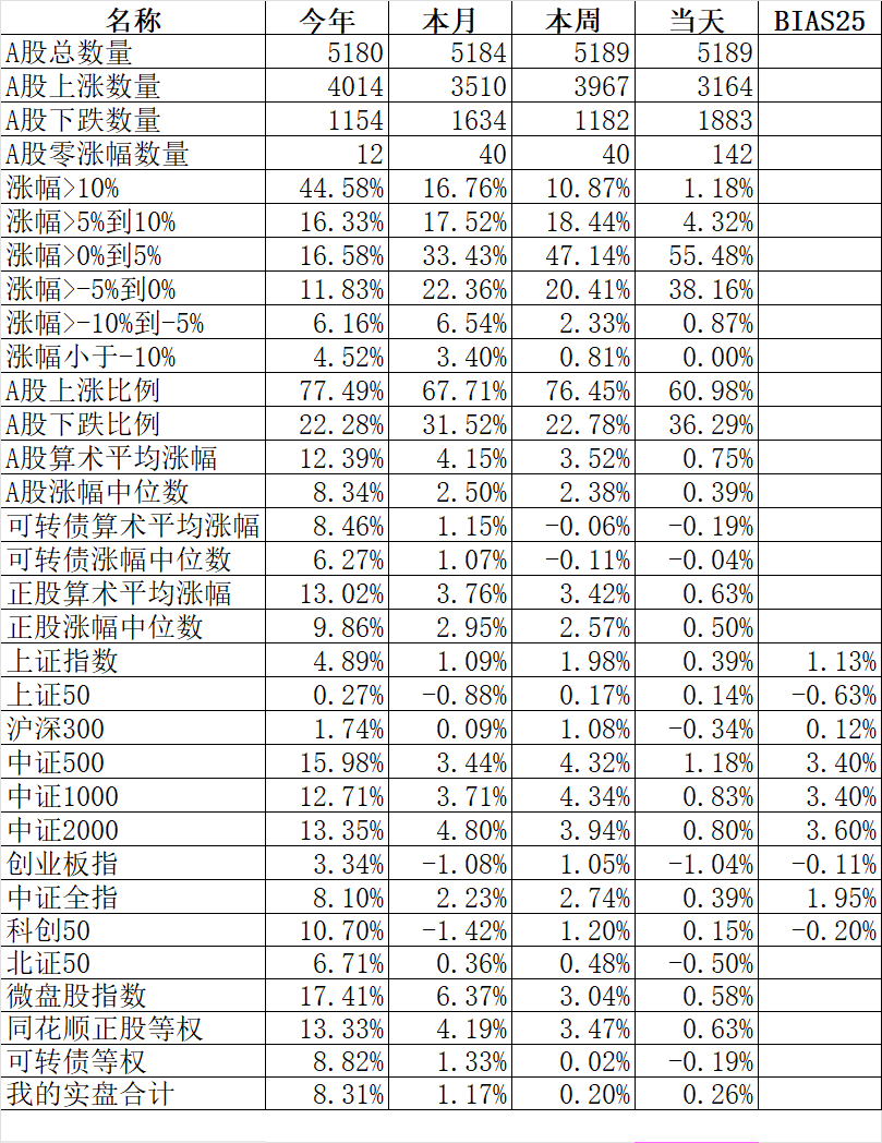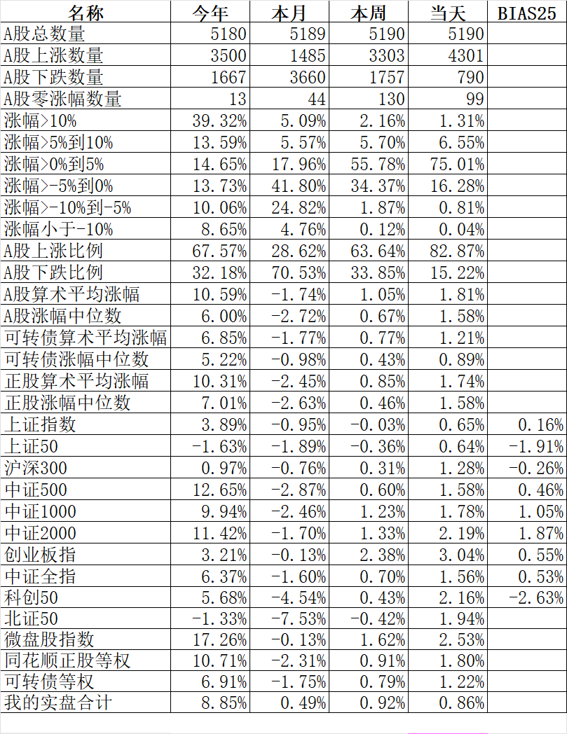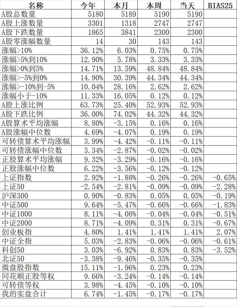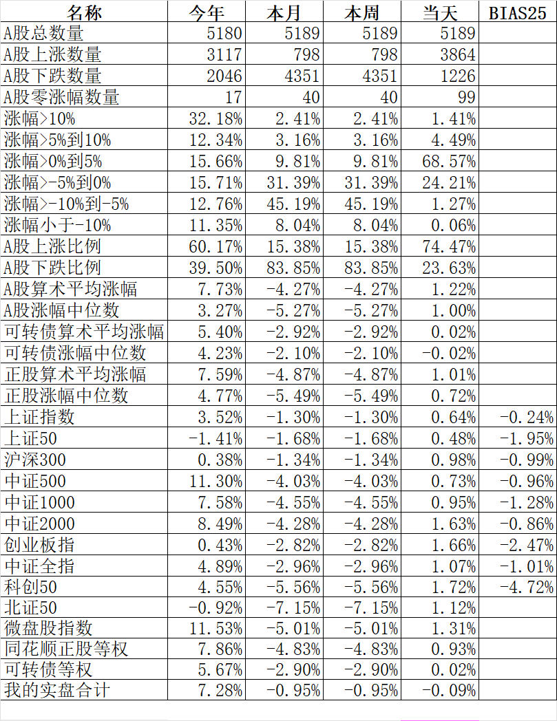 371只可转债平均下跌0.19%,对应正股平均上涨0.63%。我的主仓20只可转债平均上涨0.18%,对应正股平均上涨1.00%。