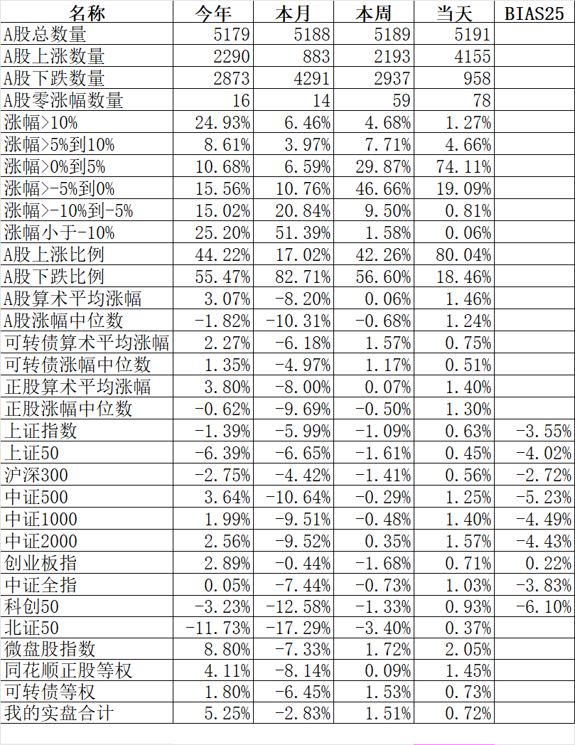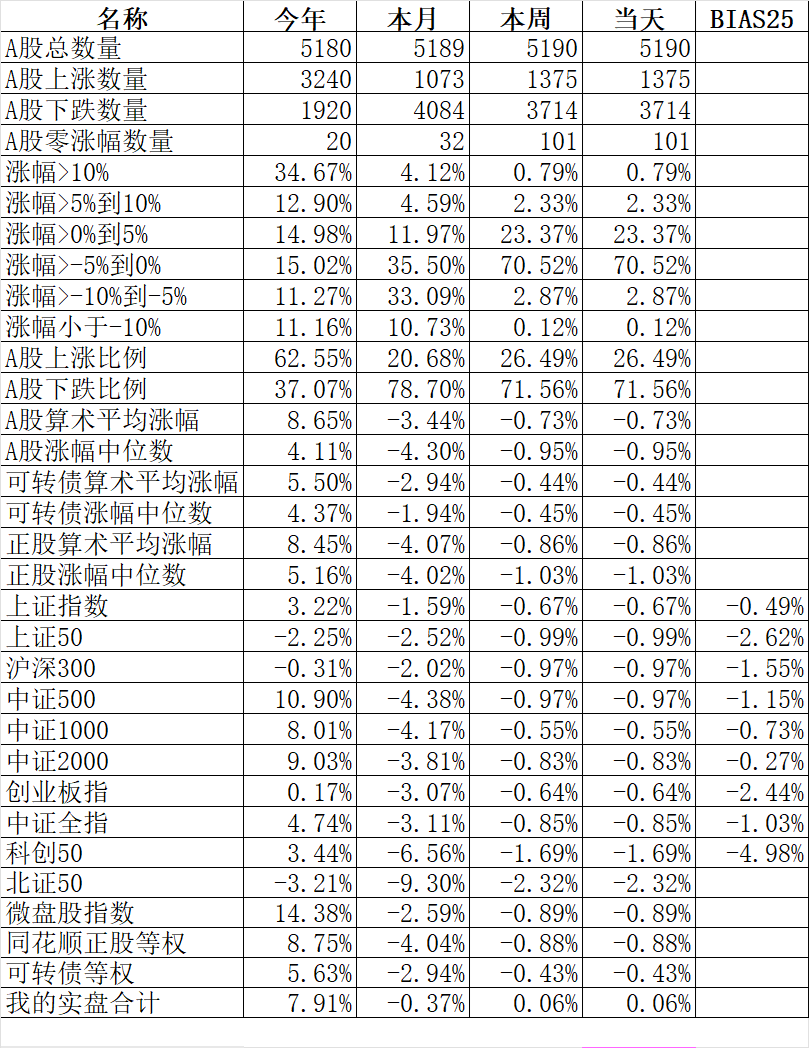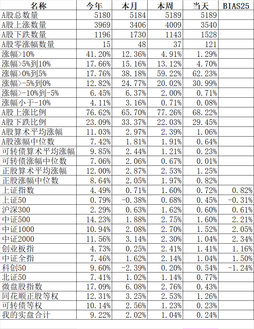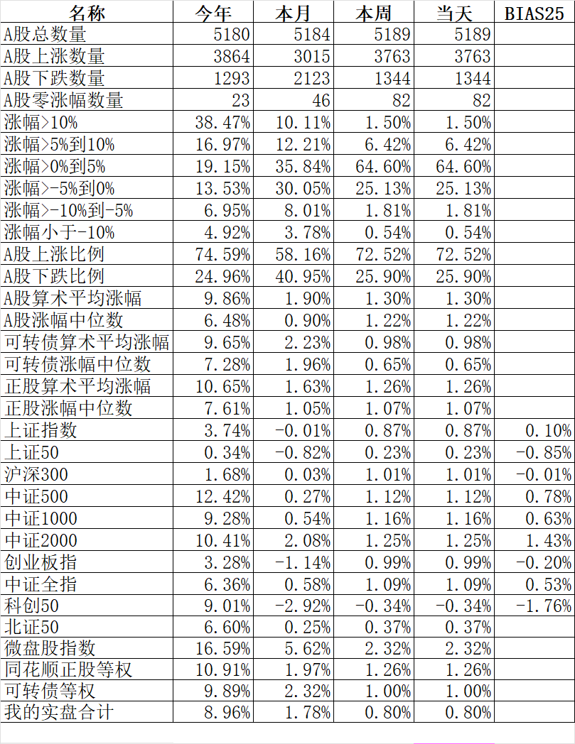 371只可转债平均下跌0.19%,对应正股平均上涨0.63%。我的主仓20只可转债平均上涨0.18%,对应正股平均上涨1.00%。