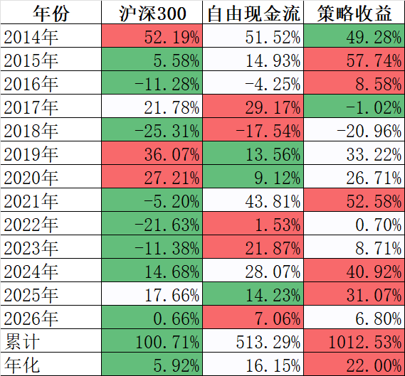 12年多,自由现金流指数明显跑赢沪深300指数,而自由现金流策略也跑赢了自由现金流指数,虽然这个指数是价格指数,我没找到全收益指数,估计年化可以再增加3%左右,这样策略还是跑赢了全收益指数。