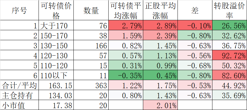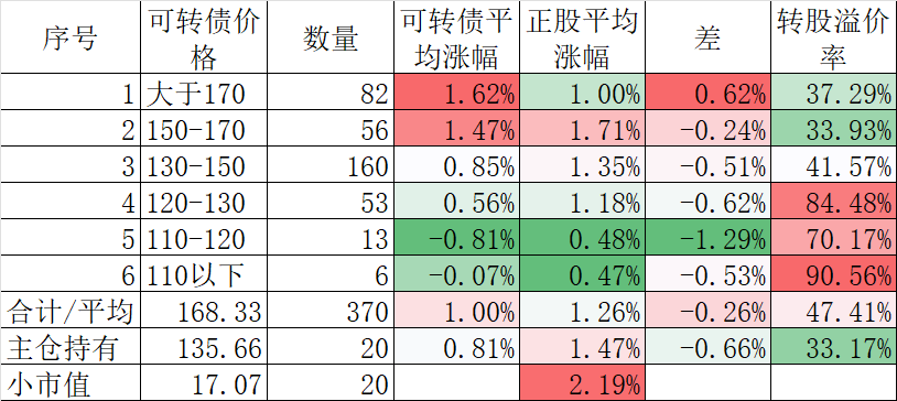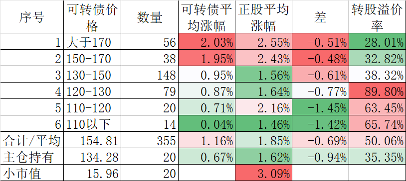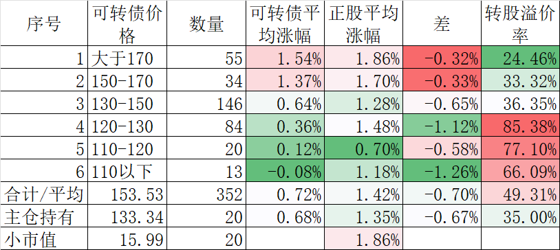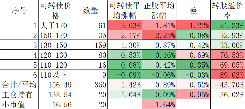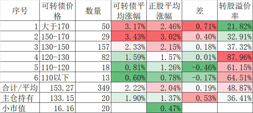 349只可转债平均涨2.22%,对应正股平均涨2.04%。我的主仓20只可转债平均涨1.90%,对应正股平均涨1.37%。
