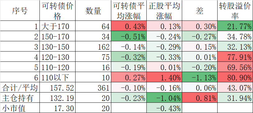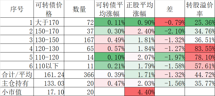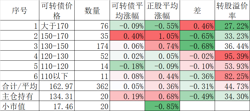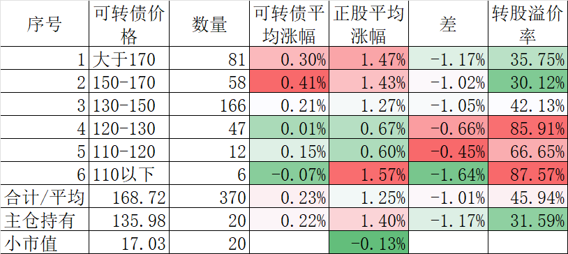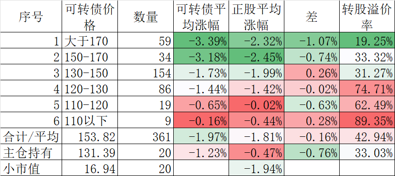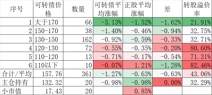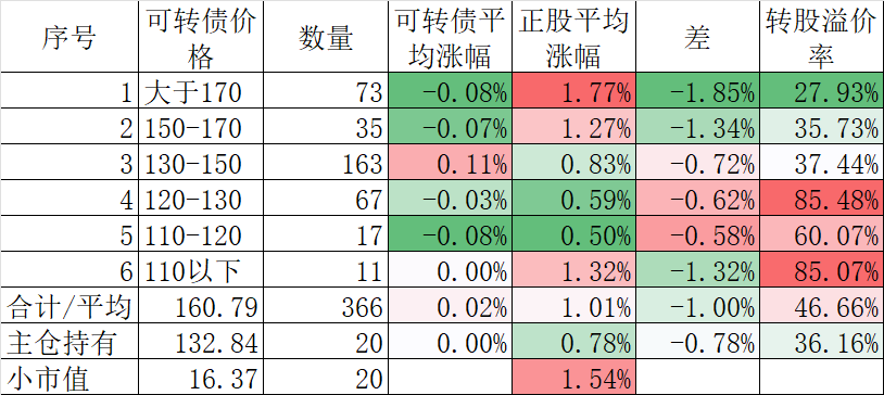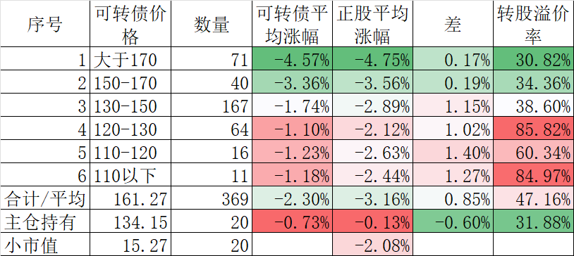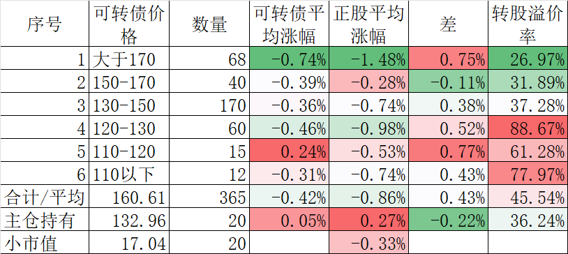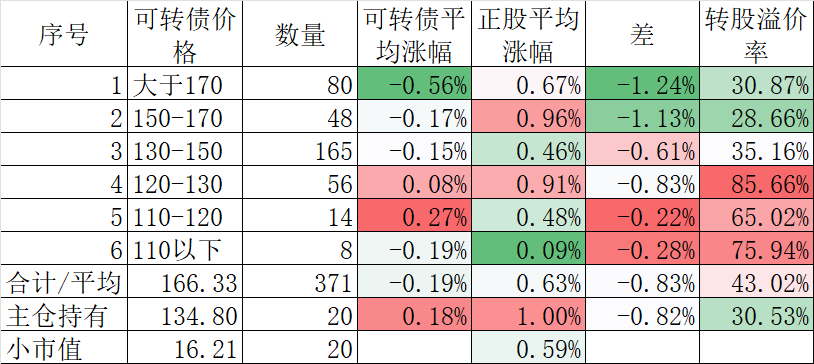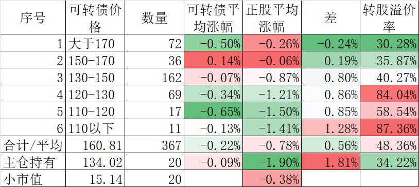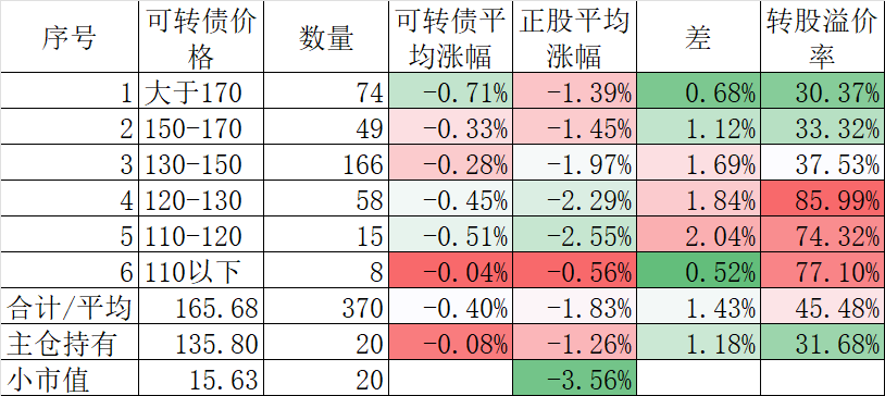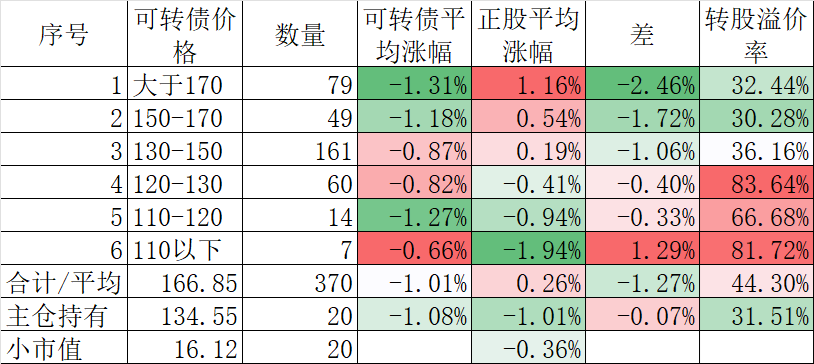 370只可转债平均下跌0.40%,对应正股平均下跌1.83%。我的主仓20只可转债平均下跌0.08%,对应正股平均下跌1.26%。