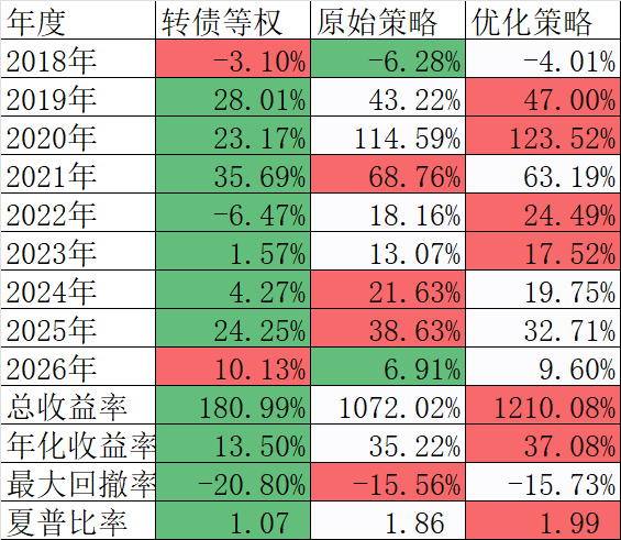今天用了禄得网智能调优,数据截止到昨天收盘,原始策略就是我现在用的可转债策略,优化策略是系统自动找到的,我选了收益率最高。年化收益率多了不到2%: