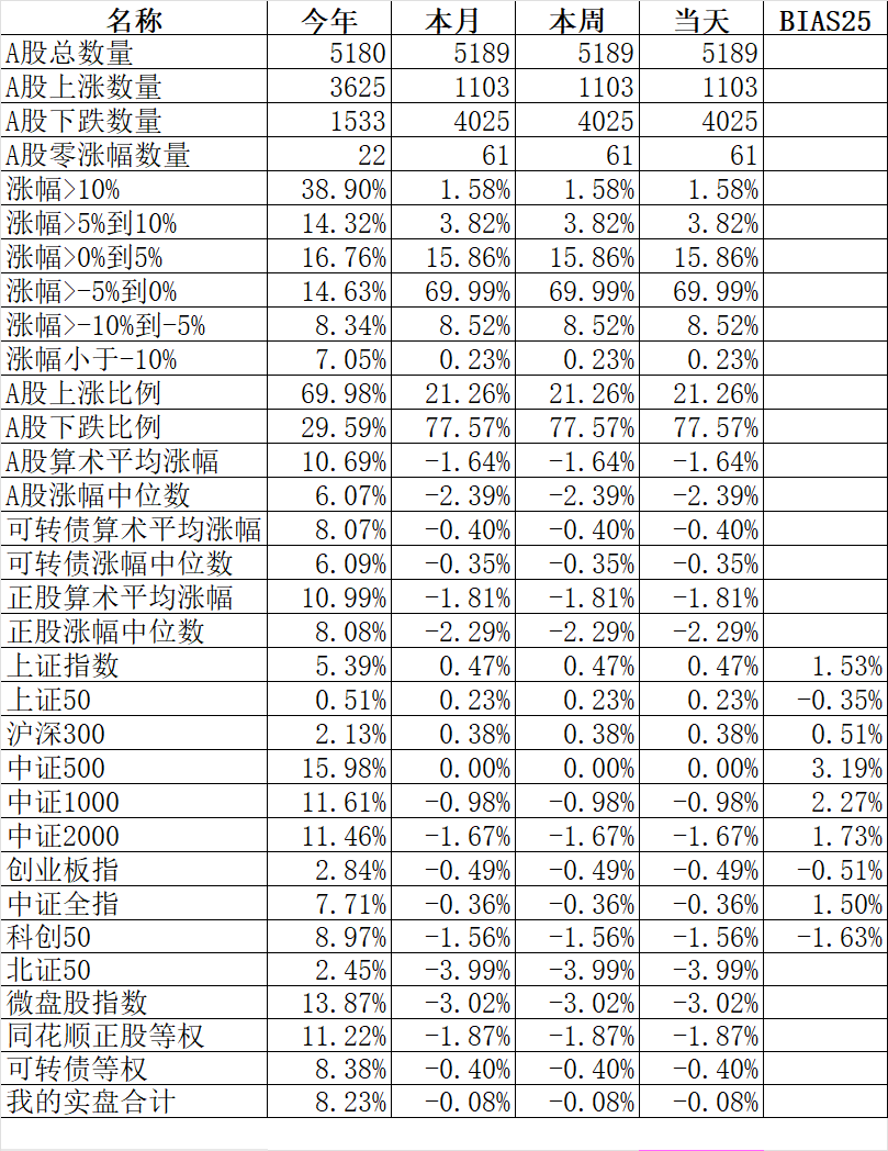 今天卖出欧22转债、瑞丰转债,买入康泰转债、漱玉转债,略有超额,但今天小账户跌的多了点,最终账户合计还是下跌0.08%。