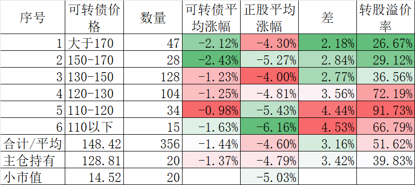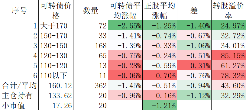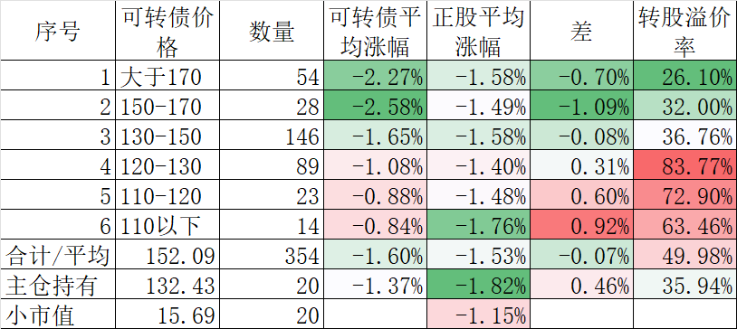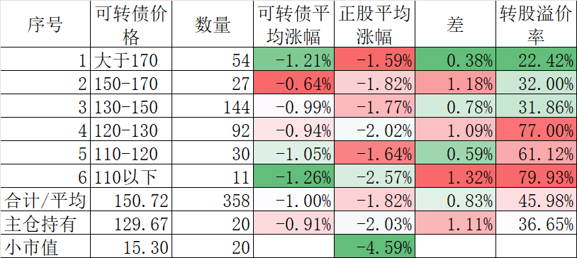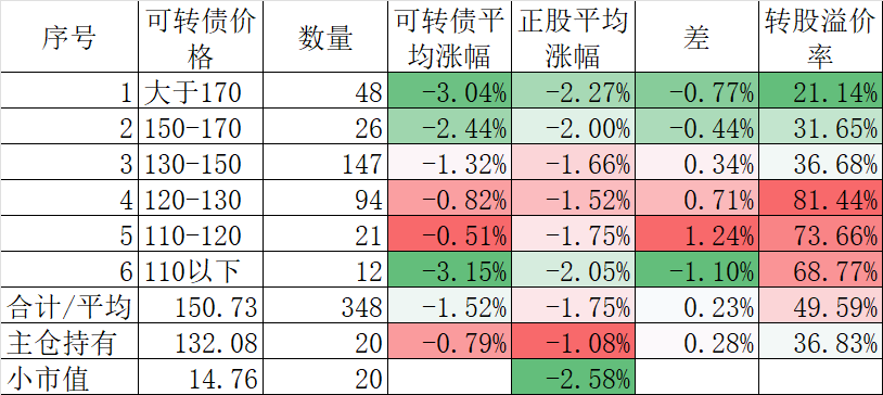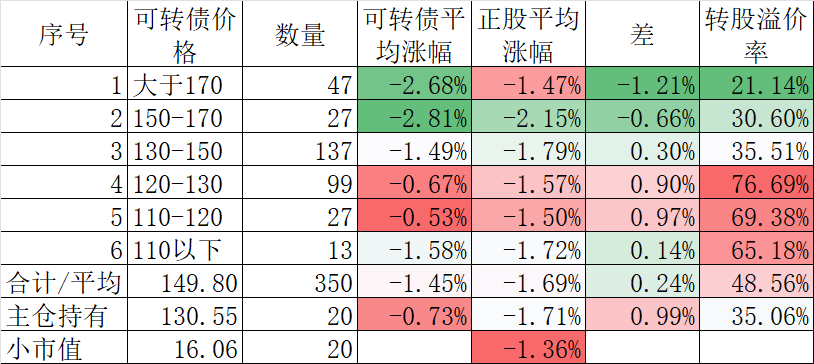 350只可转债平均下跌1.45%,对应正股平均下跌1.69%。我的主仓20只可转债平均下跌0.73%,对应正股平均下跌1.71%。
