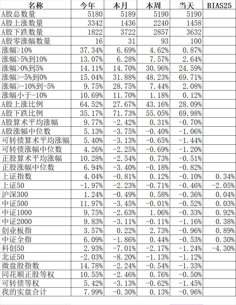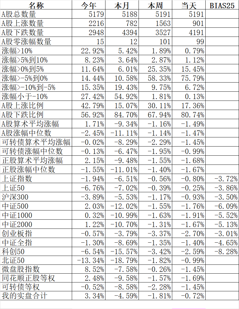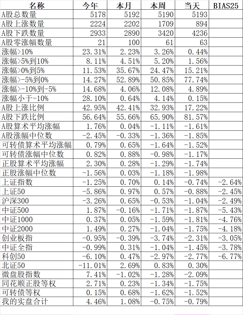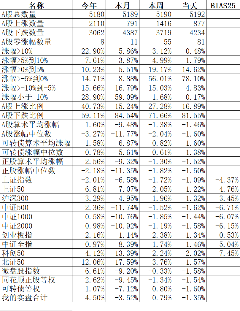 894只个股上涨,4236只个股下跌,涨幅中位数-1.86%。