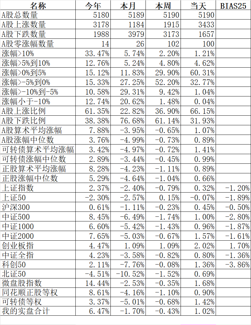 370只可转债平均上涨1.00%,对应正股平均上涨1.26%。我的20只可转债平均上涨0.81%,对应正股平均上涨1.47%。