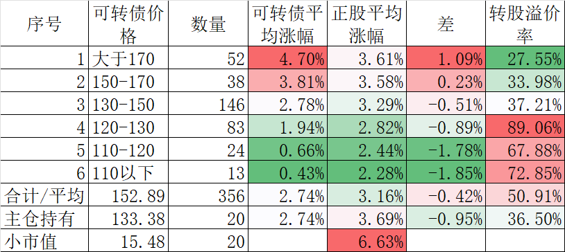 今天可转债继续杀溢价,全市场可转债对应的正股平均上涨了0.63%,应该说还是不错的,但可转债平均缺下跌了0.19%。主要还是高价债跌的多。每次小登股一调整,高价债就跌的多,账户就容易战胜可转债等权指数。反之亦然。