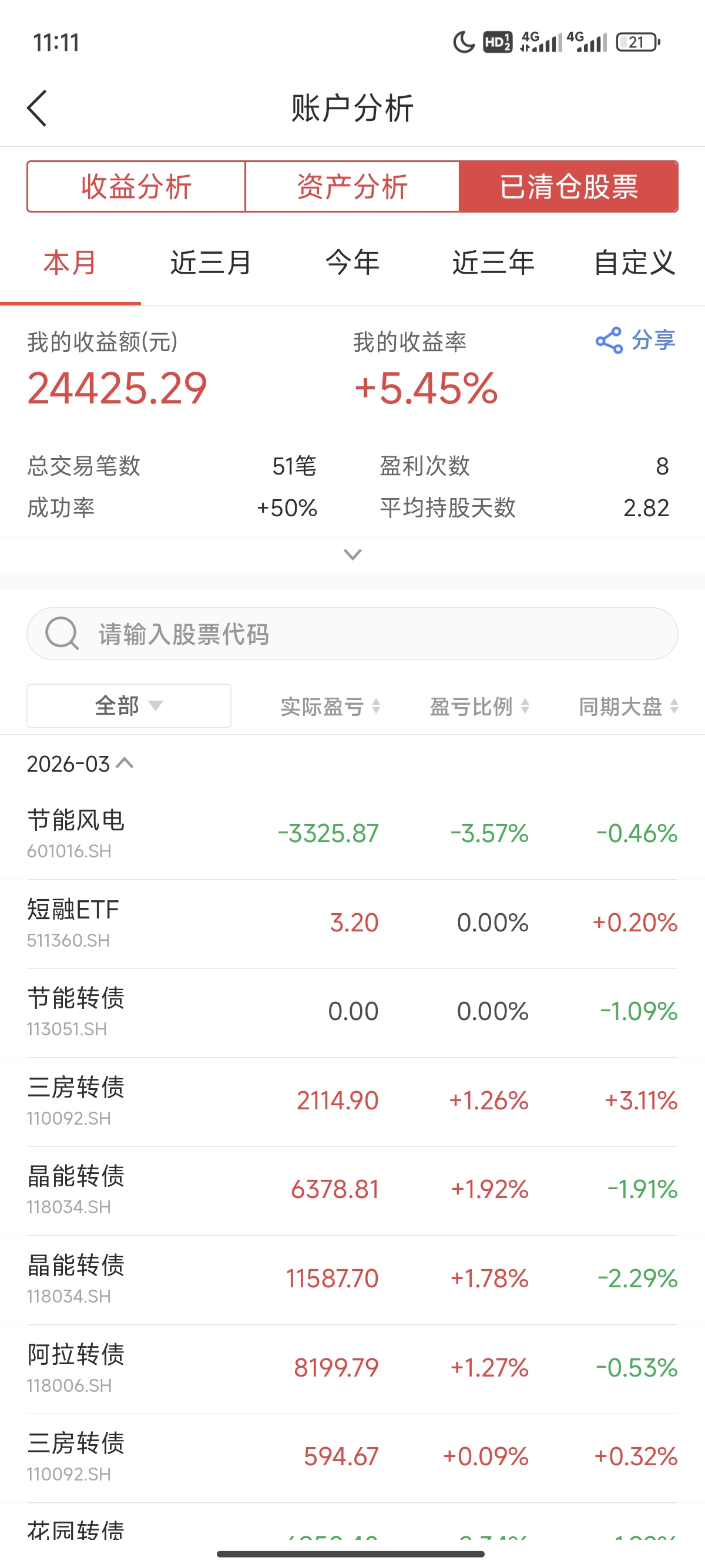 今天上午卖出三房转债,买入节能转债。最终账户合计上涨0.26%。今天超额主要是正股涨幅远超市场,再加上卖出三房转债的时候几乎是上午最高点,卖出后一路下跌,而节能转债买入后上涨了。