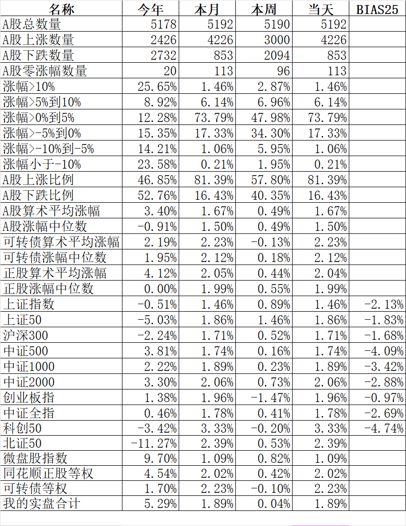4226只个股上涨,853只个股下跌,涨幅中位数1.50%。
