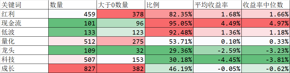 最后,我在25142只基金中从基金名称里提取了7个关键词:红利、现金流、低波、量化、龙头、科技、成长,分别做了统计: