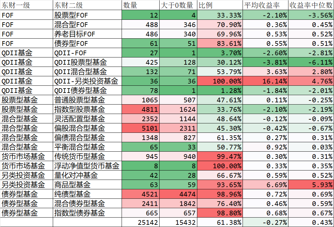 数量最庞大的5101只偏股混合型基金,今年盈利比例也只有45.30%,平均收益率-0.42%,中位数-0.67%。