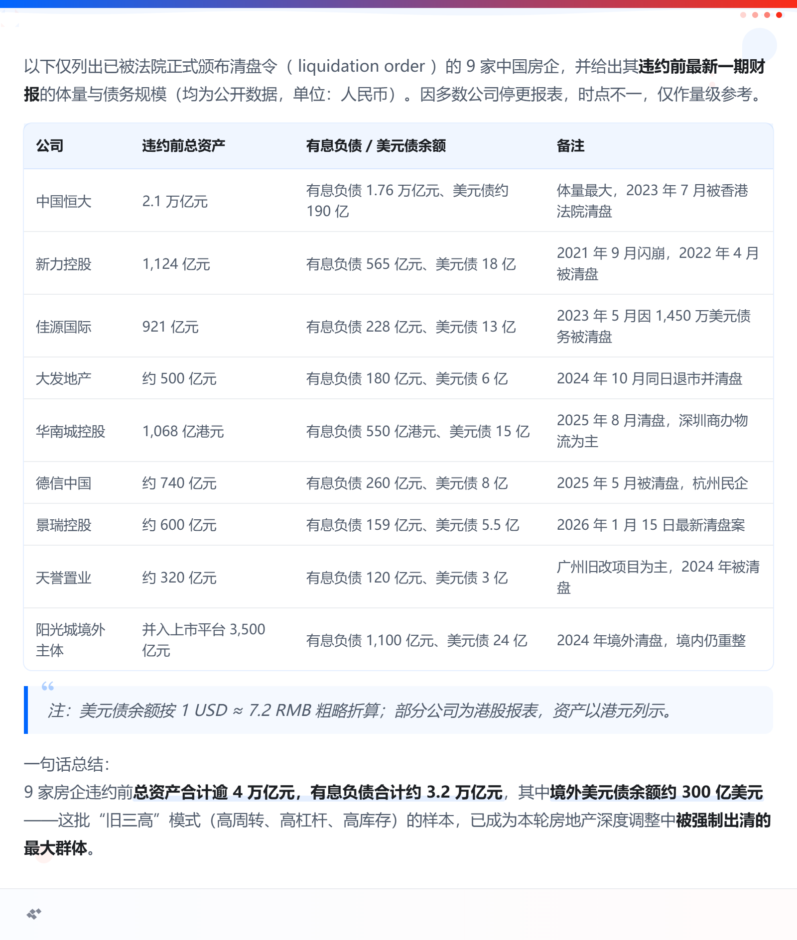 - 2025 年 8 月:华南城控股被香港法院清盘,境外债权人回收率 0–1%,境内项目由政府指定国企托管续建。- 2025 年 2 月:中国恒大旗下天基控股亦被清盘,清盘人仍在全球追索资产,预计回收率 2–3%。
